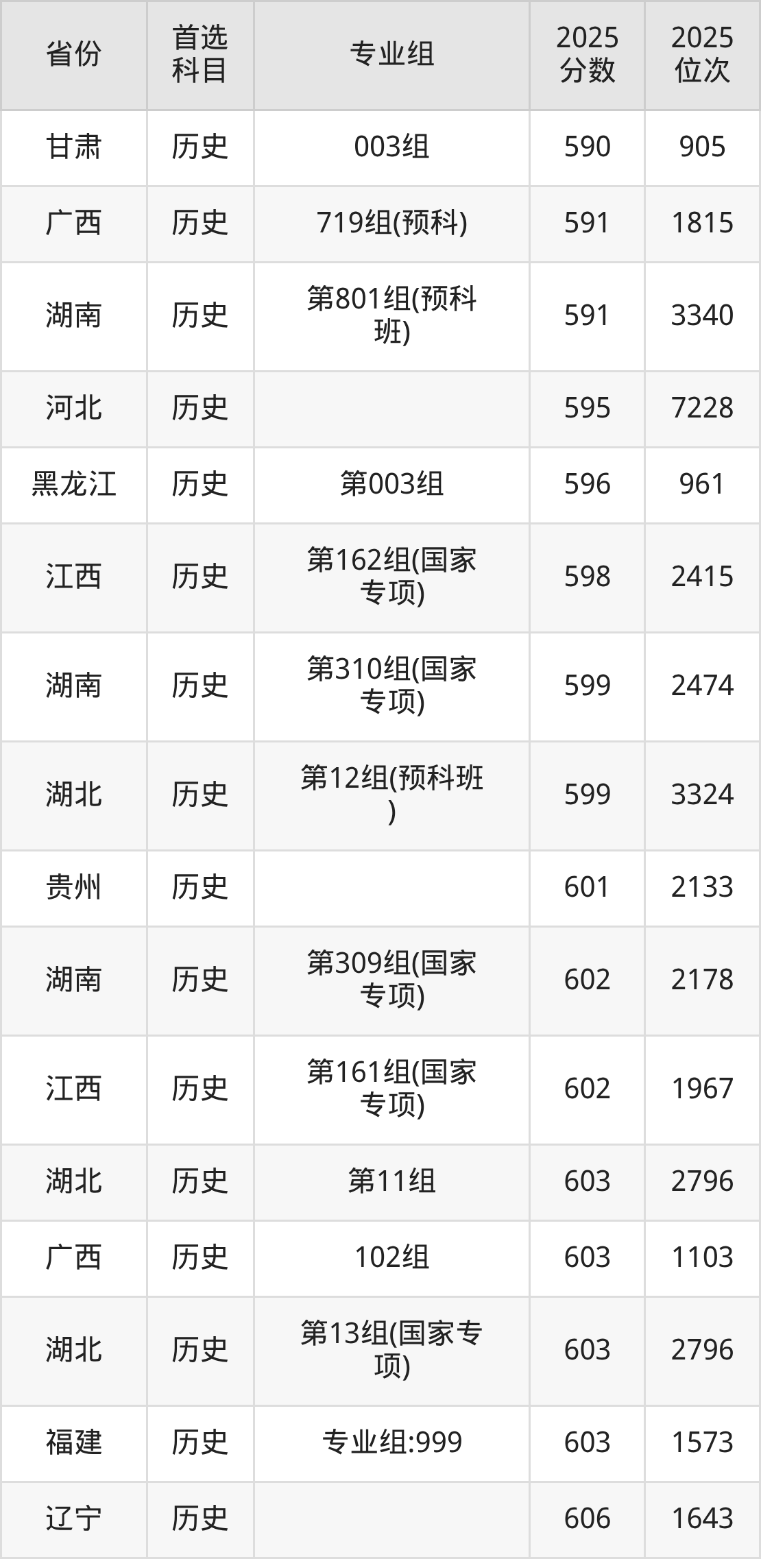 历史类:第11组603分、2796名,第12组(预科班)599分、3324名,第13组(国家专项)603分、2796名;