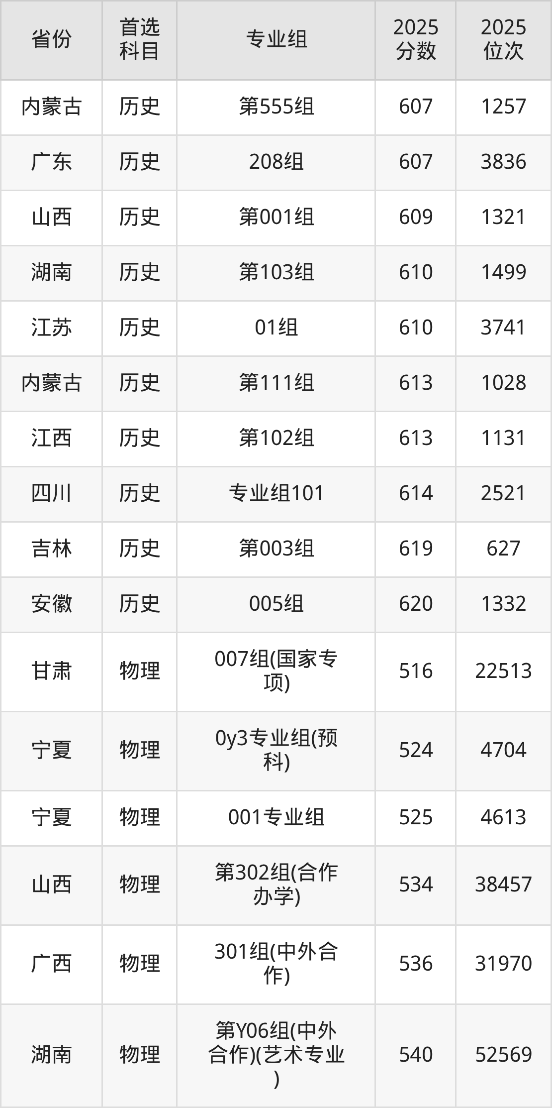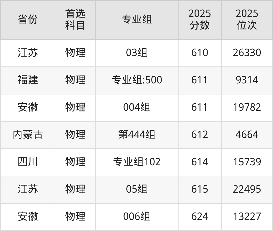 物理类:第13组(预科班)602分、16685名,第14组627分、7659名,第15组601分、17139名,第16组599分、18084名,第17组(国家专项)600分、17613名,第18组611分、12932名;