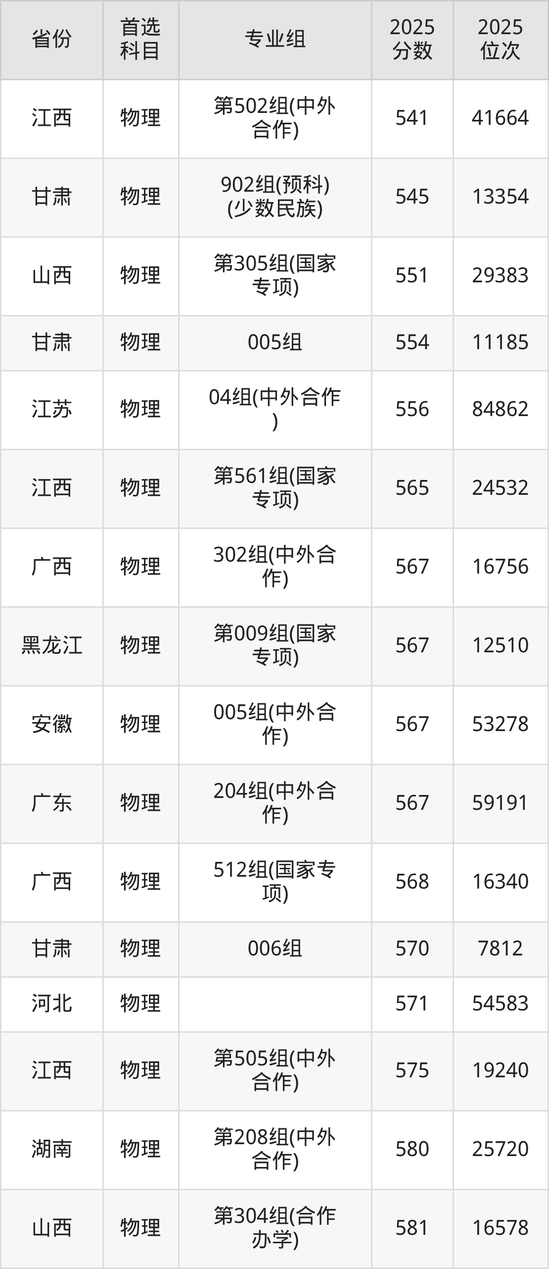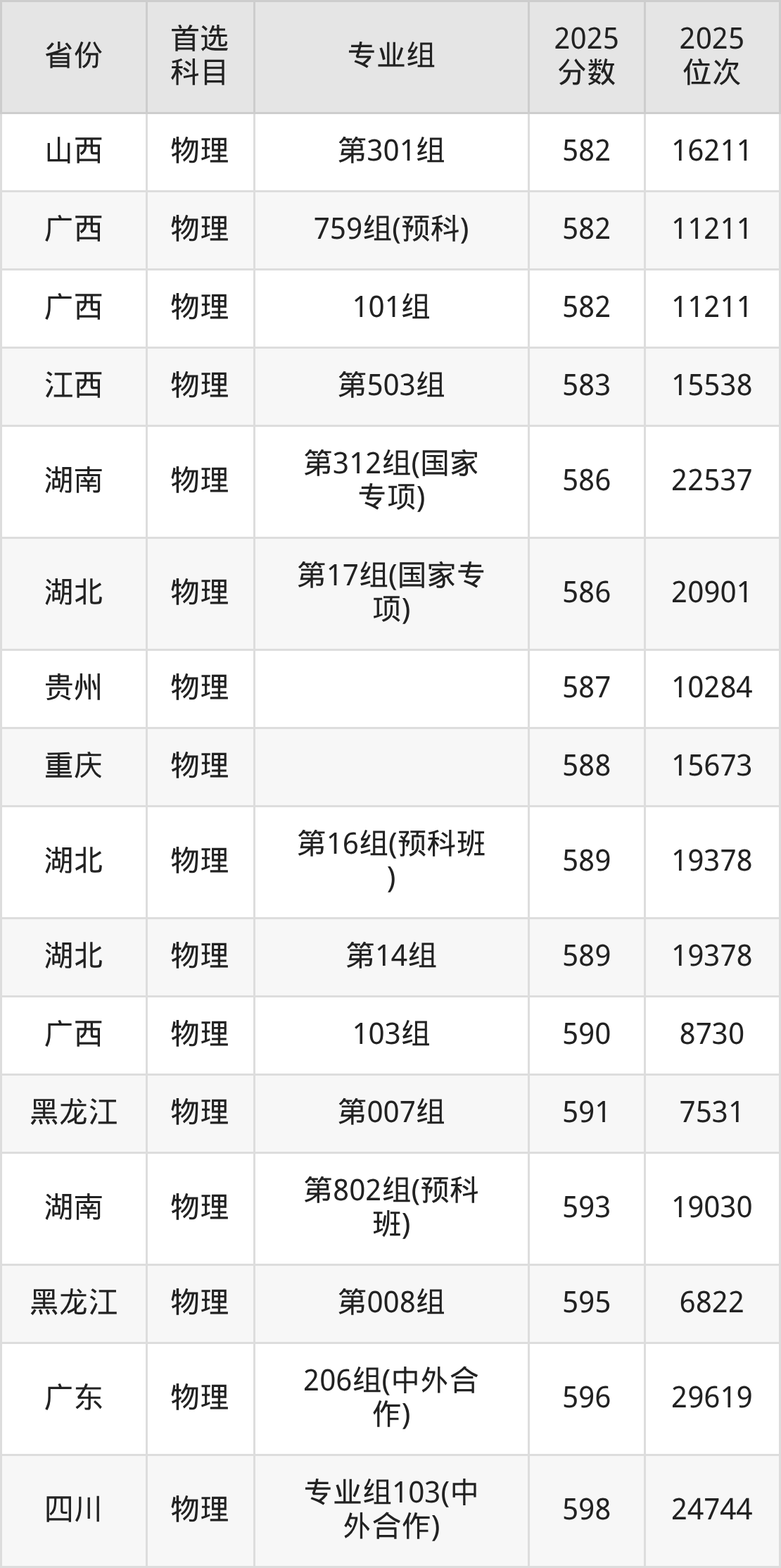 物理类:第14组589分、19378名,第15组603分、13014名,第16组(预科班)589分、19378名,第17组(国家专项)586分、20901名;