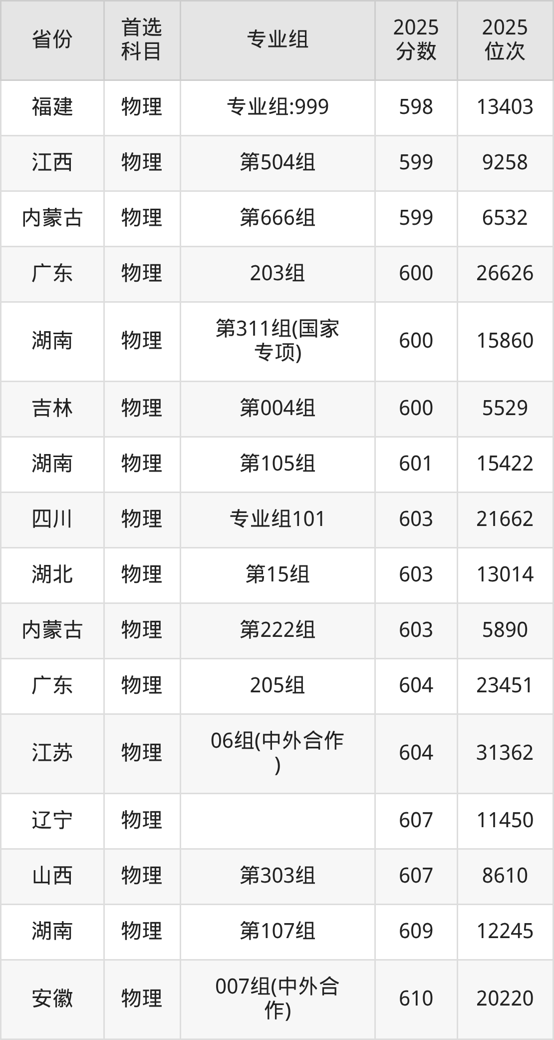 物理类:第10组603分、18018名,第11组632分、7635名,第12组623分、10403名,第13组(国家专项)607分、16315名,第14组(预科班)605分、17131名。