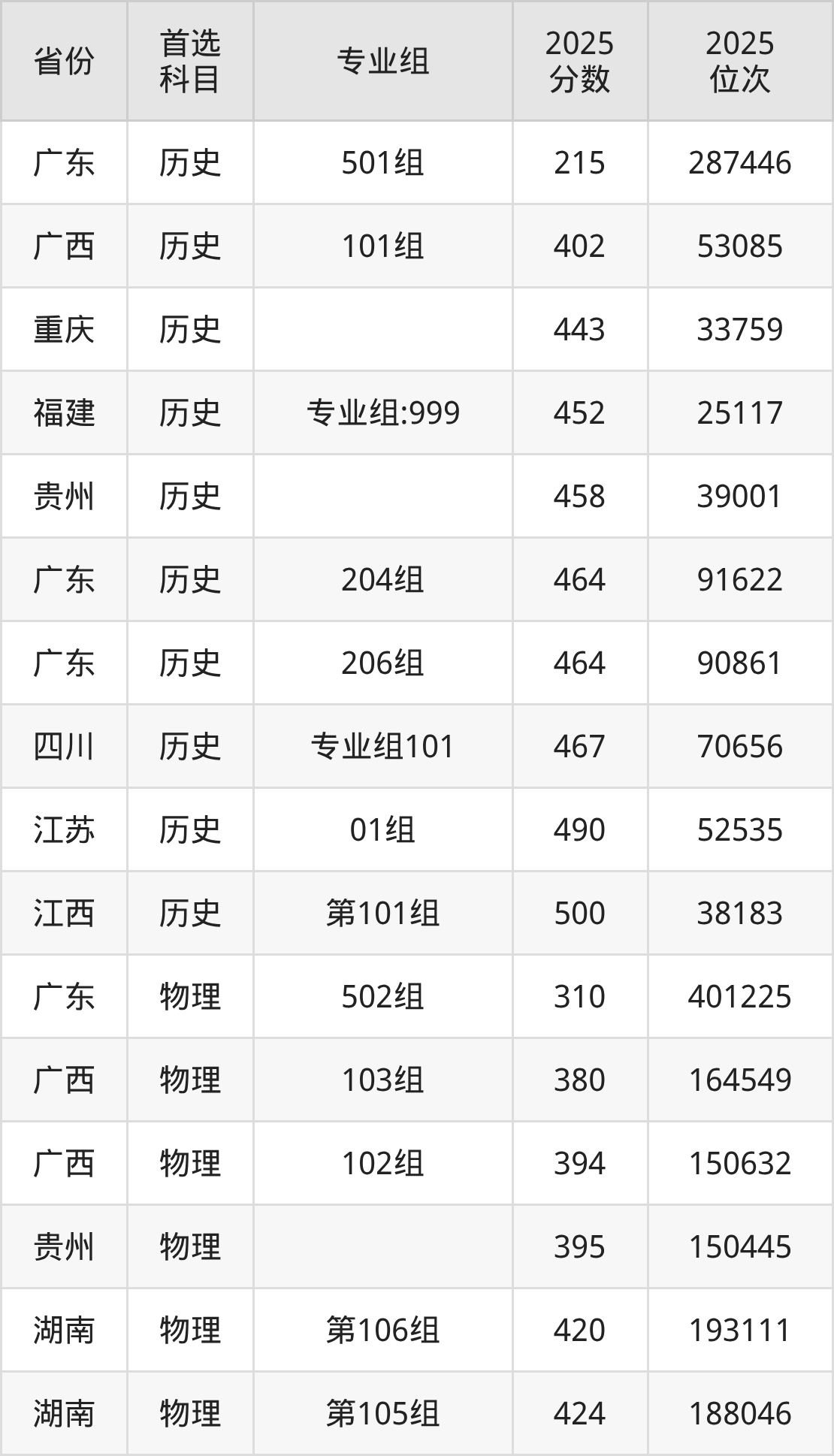 历史类最低分对应地区为广东(501组),录取位次为287446;最高分对应地区为江西(第101组),录取位次为38183,超本科线14分。