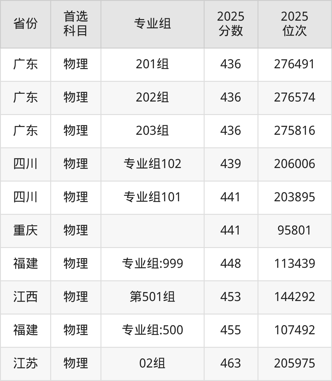 物理类最低分对应地区为广东(502组),录取位次为401225;最高分对应地区为江苏(02组),录取位次为205975。