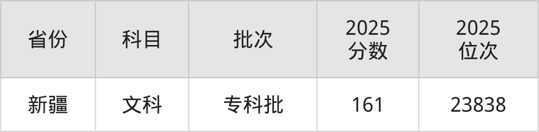 文科最低分对应地区为新疆,录取位次为23838,超专科线21分。
