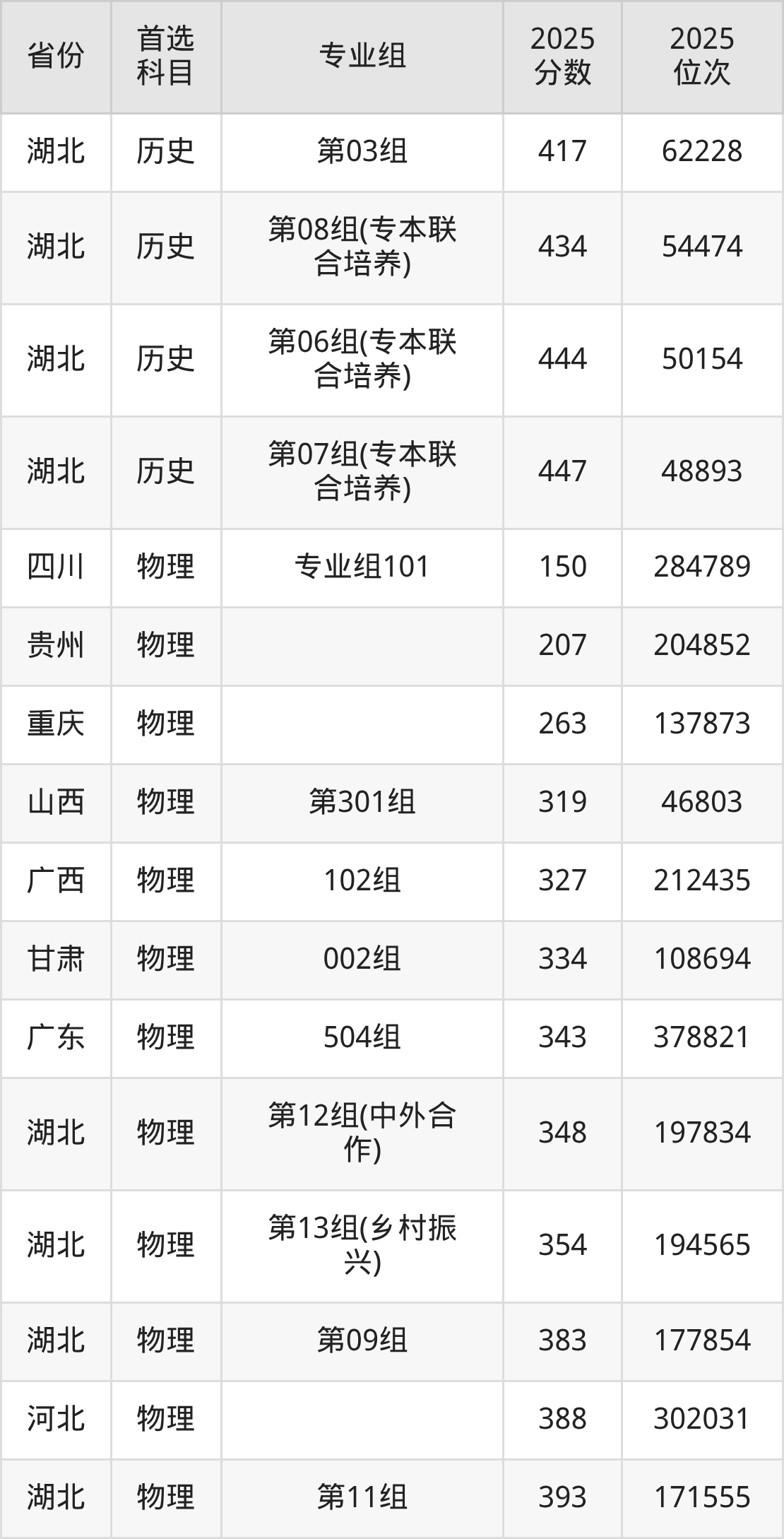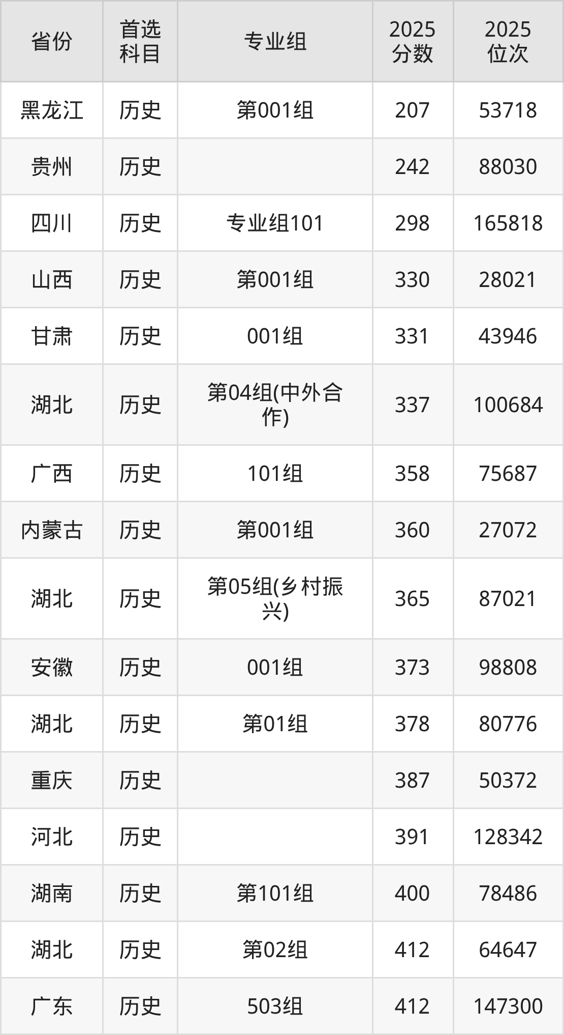 历史类:第01组378分、80776名,第02组412分、64647名,第03组417分、62228名,第04组(中外合作)337分、100684名,第05组(乡村振兴)365分、87021名,第06组(专本联合培养)444分、50154名,第07组(专本联合培养)447分、48893名,第08组(专本联合培养)434分、54474名;