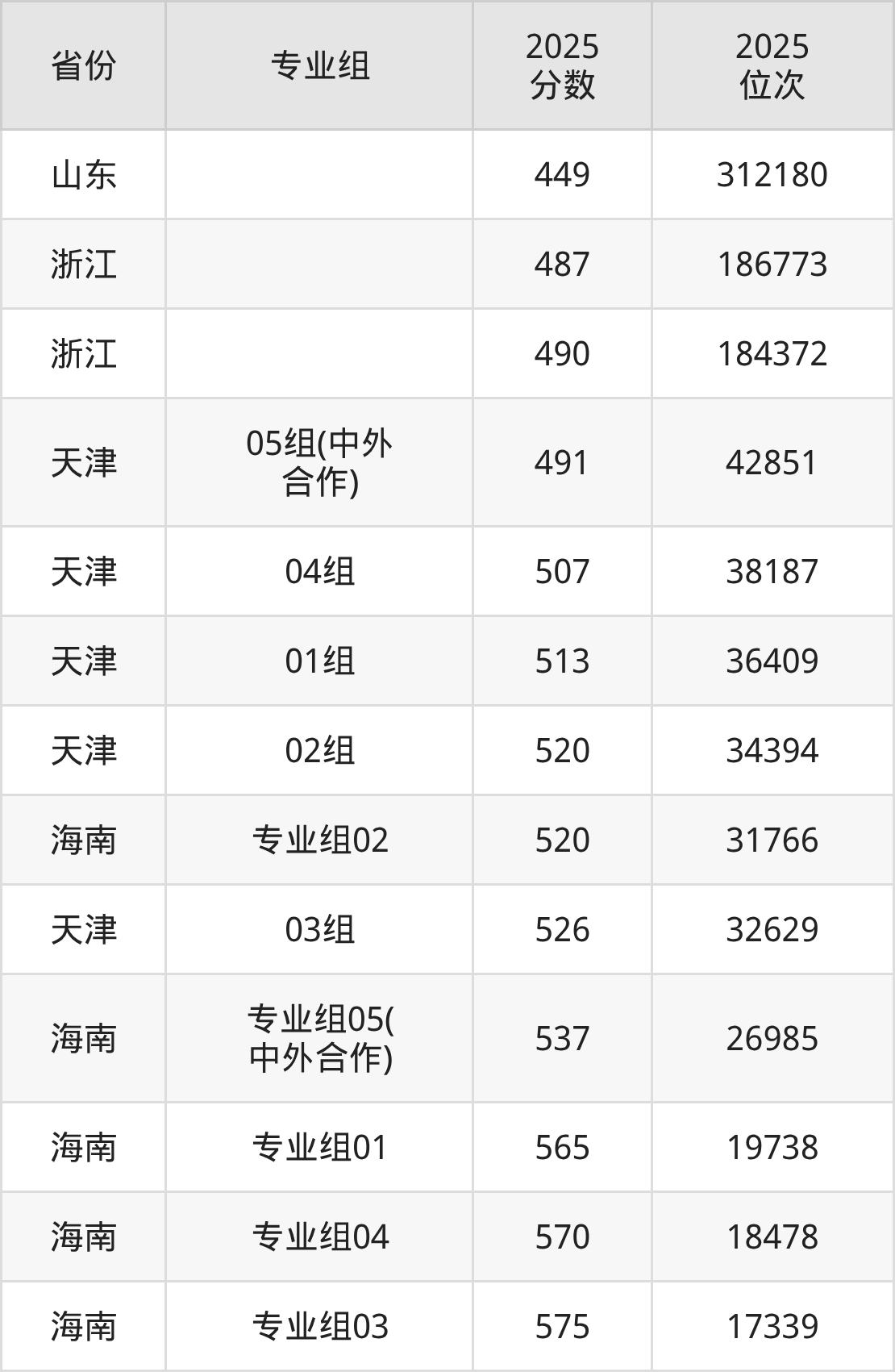 最低分对应地区为山东,录取位次为312180,超一段线66分;最高分对应地区为海南(专业组03),录取位次为17339,超本科线95分。