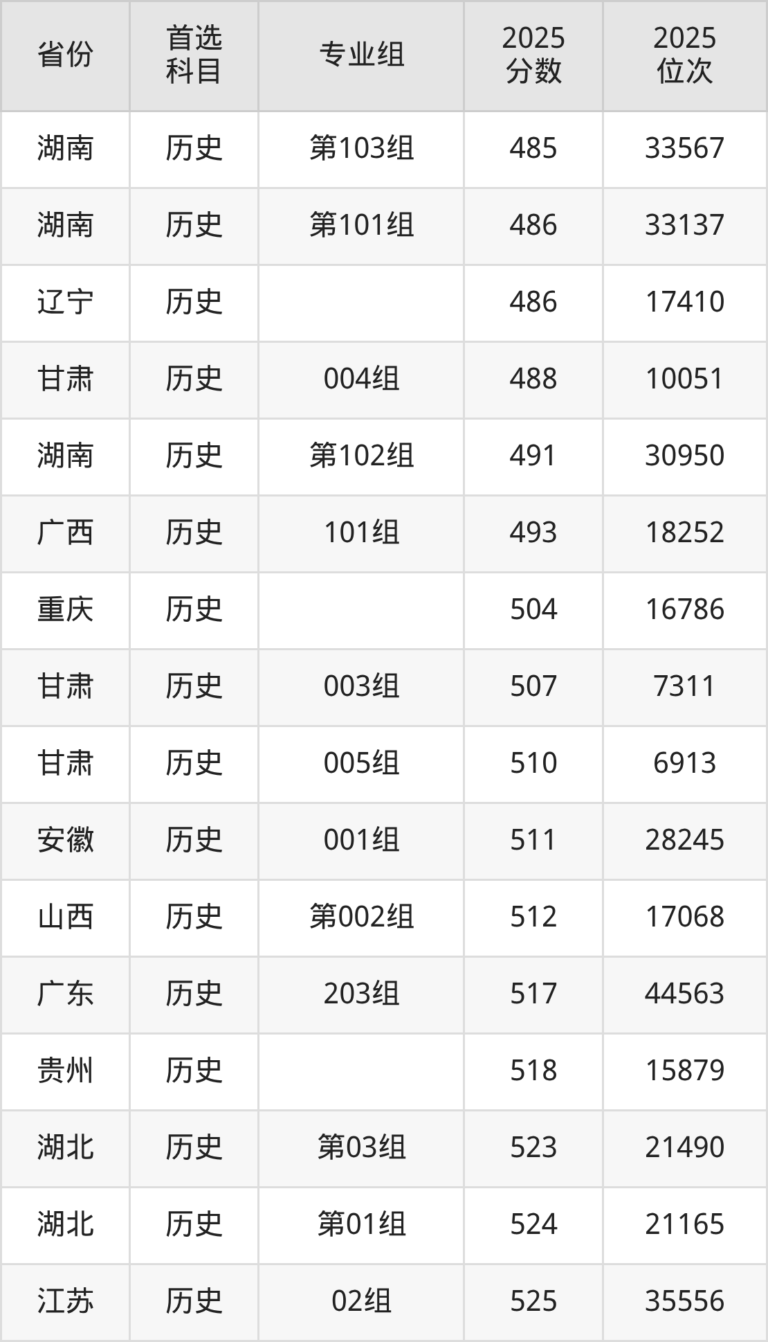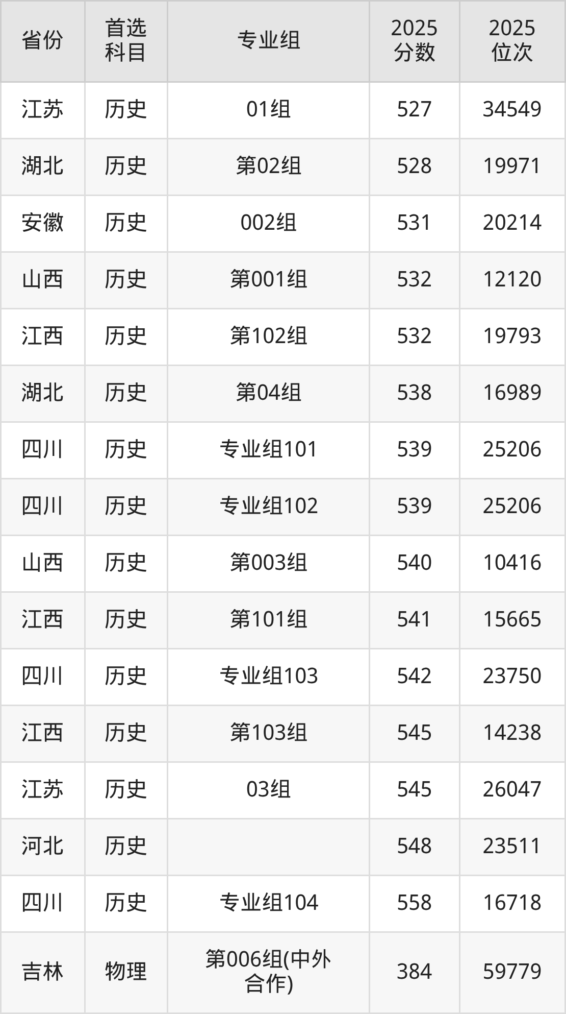 历史类最低分对应地区为吉林(第002组),录取位次为20971,超本科线6分;最高分对应地区为四川(专业组104),录取位次为16718,超本科B91分。