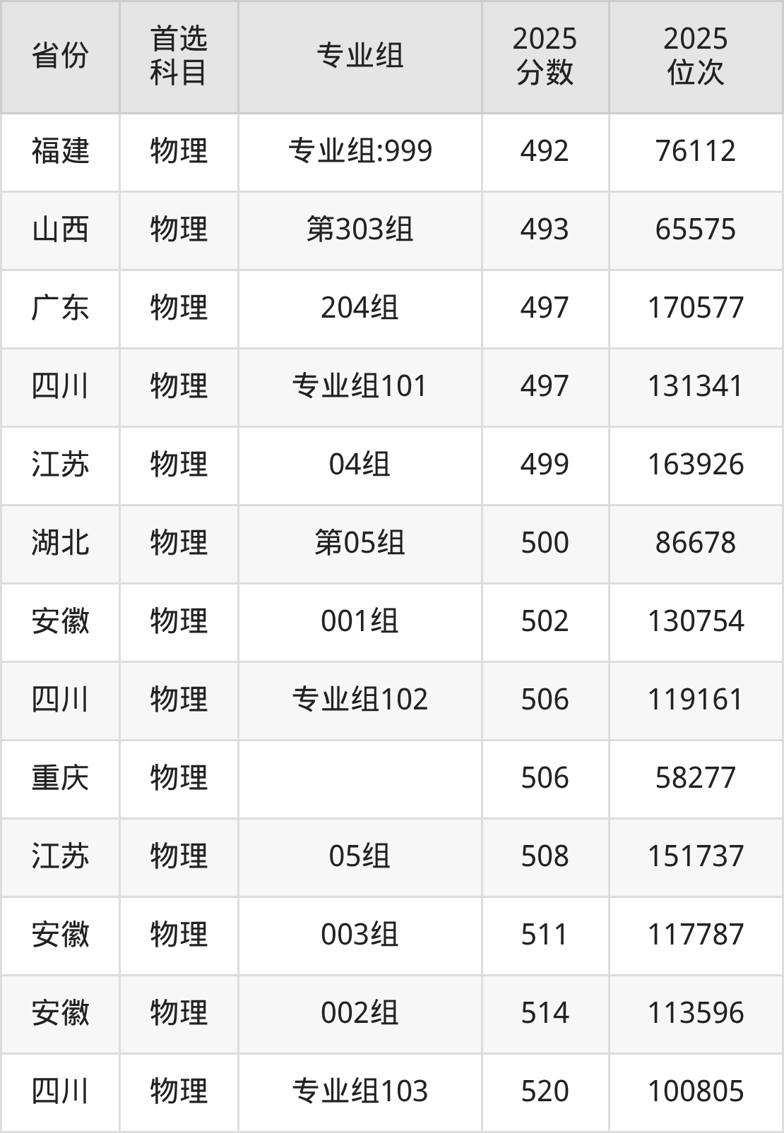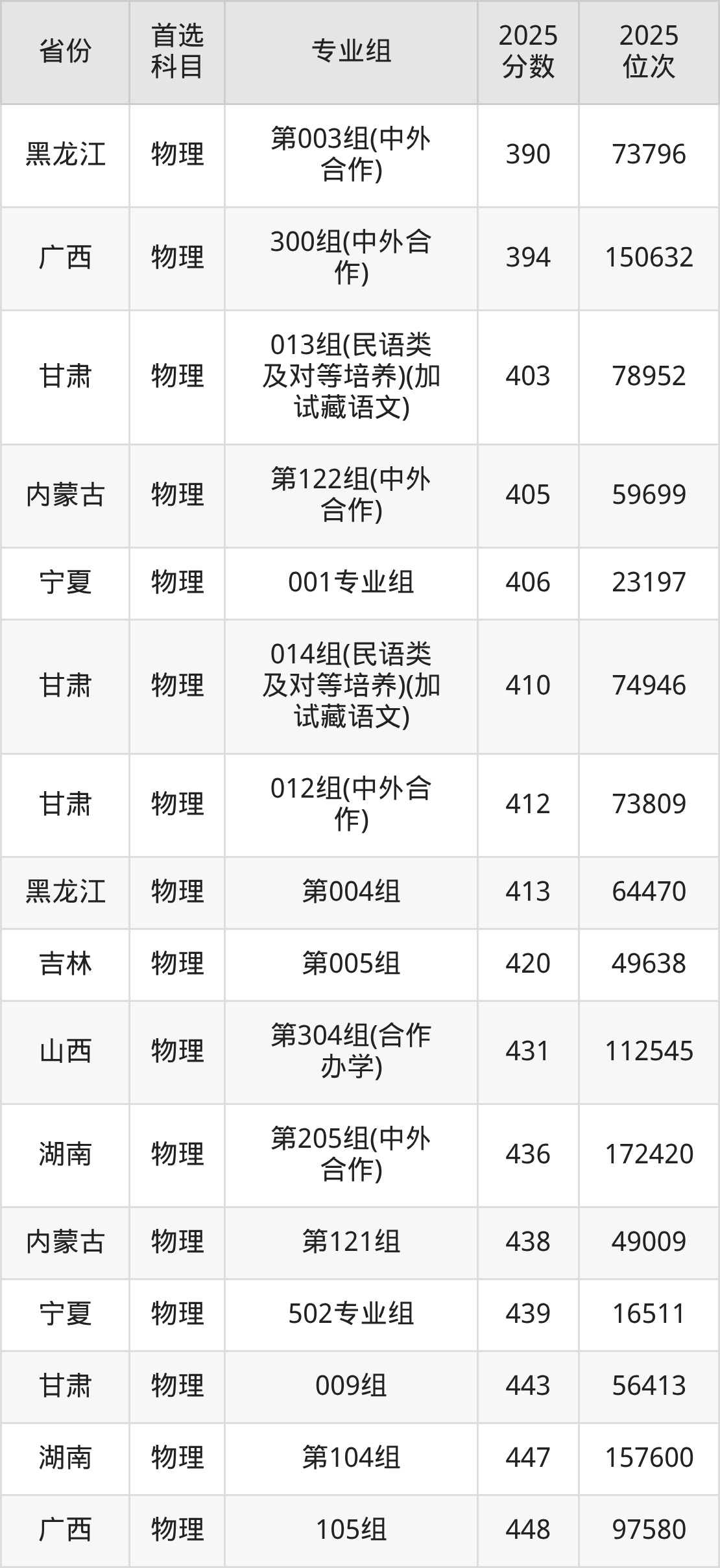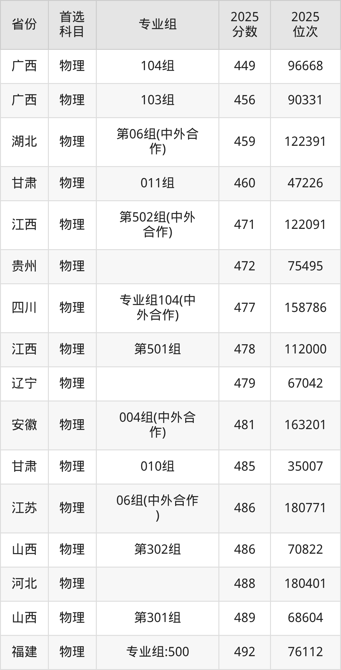 物理类最低分对应地区为吉林(第006组(中外合作)),录取位次为59779,超本科线44分;最高分对应地区为四川(专业组103),录取位次为100805,超本科B82分。