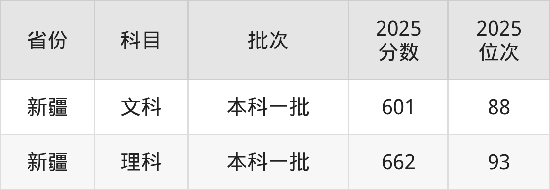 文科最低分对应地区为新疆,录取位次为88。