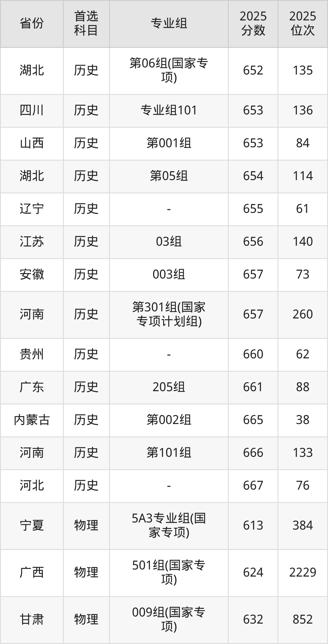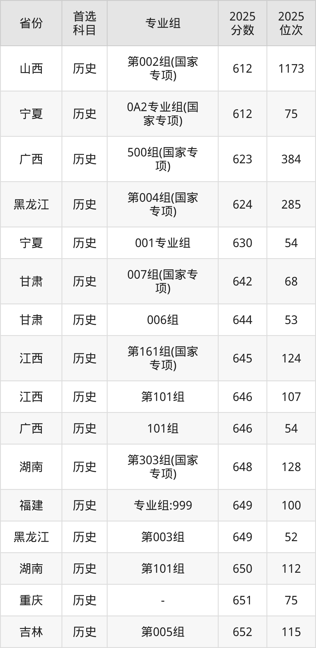 历史类最低分对应地区为山西(第002组(国家专项)),录取位次为1173,超本科线169分;最高分对应地区为河北,录取位次为76。