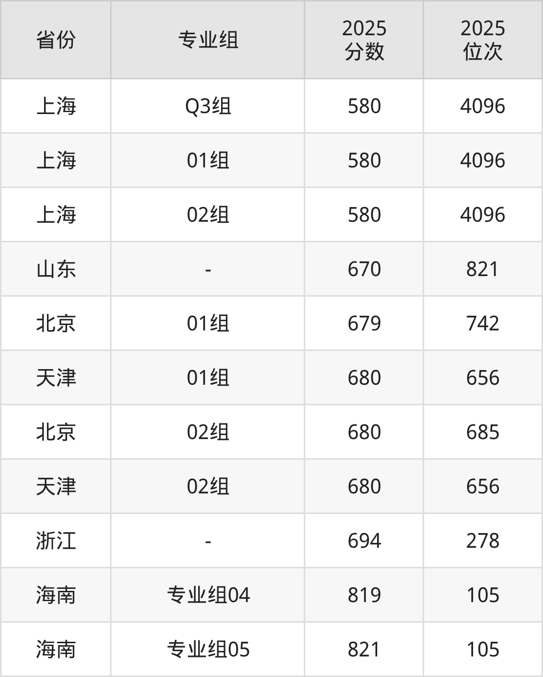 最低分对应地区为上海(Q3组),录取位次为4096,超本科线178分;最高分对应地区为海南(专业组05),录取位次为105,超本科线341分。