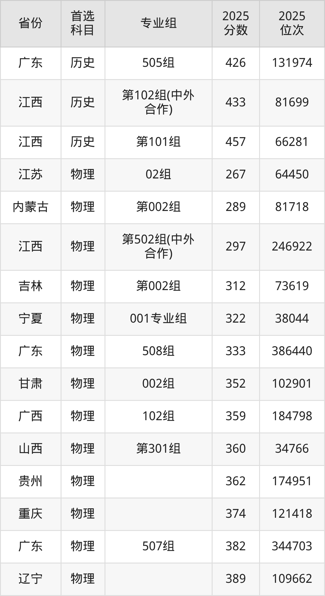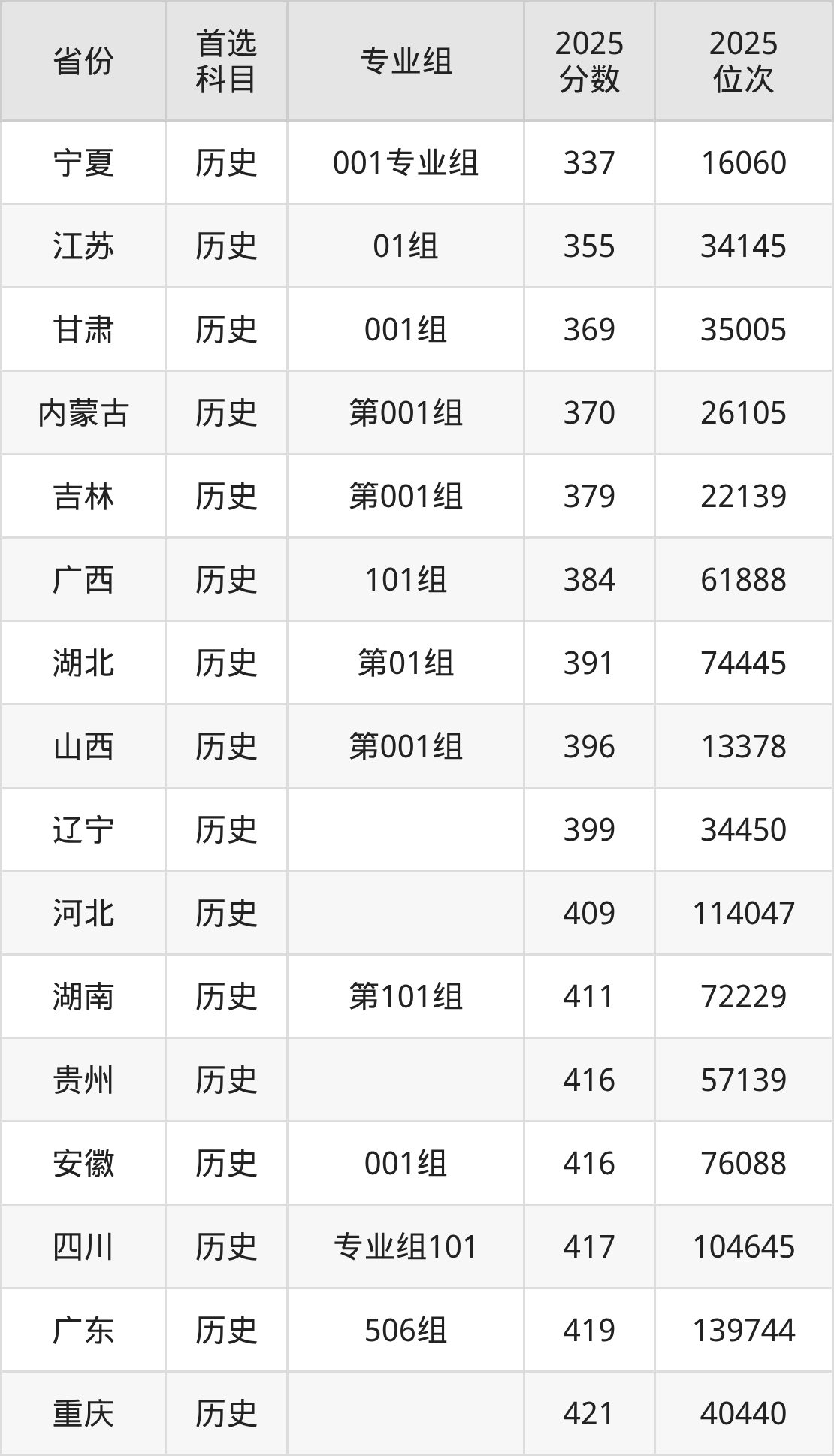 历史类最低分对应地区为宁夏(001专业组),录取位次为16060,超专科线187分;最高分对应地区为江西(第101组),录取位次为66281,超专科线167分。