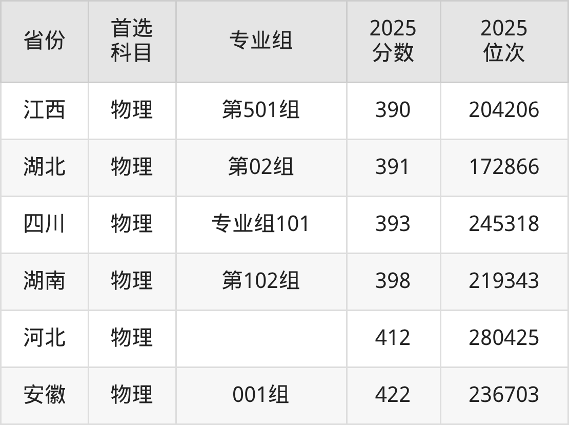 物理类最低分对应地区为江苏(02组),录取位次为64450,超专科线47分;最高分对应地区为安徽(001组),录取位次为236703,超专科线222分。