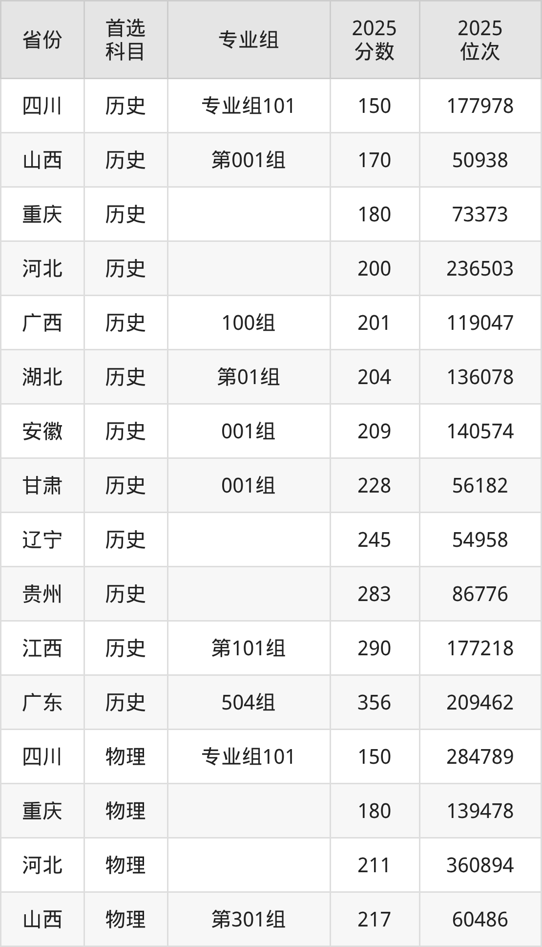 历史类最低分对应地区为四川(专业组101),录取位次为177978;最高分对应地区为广东(504组),录取位次为209462,超专科线141分。