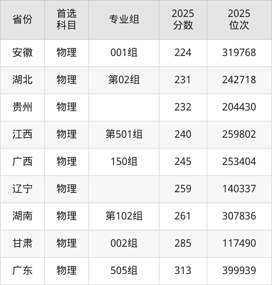 物理类最低分对应地区为四川(专业组101),录取位次为284789;最高分对应地区为广东(505组),录取位次为399939,超专科线113分。