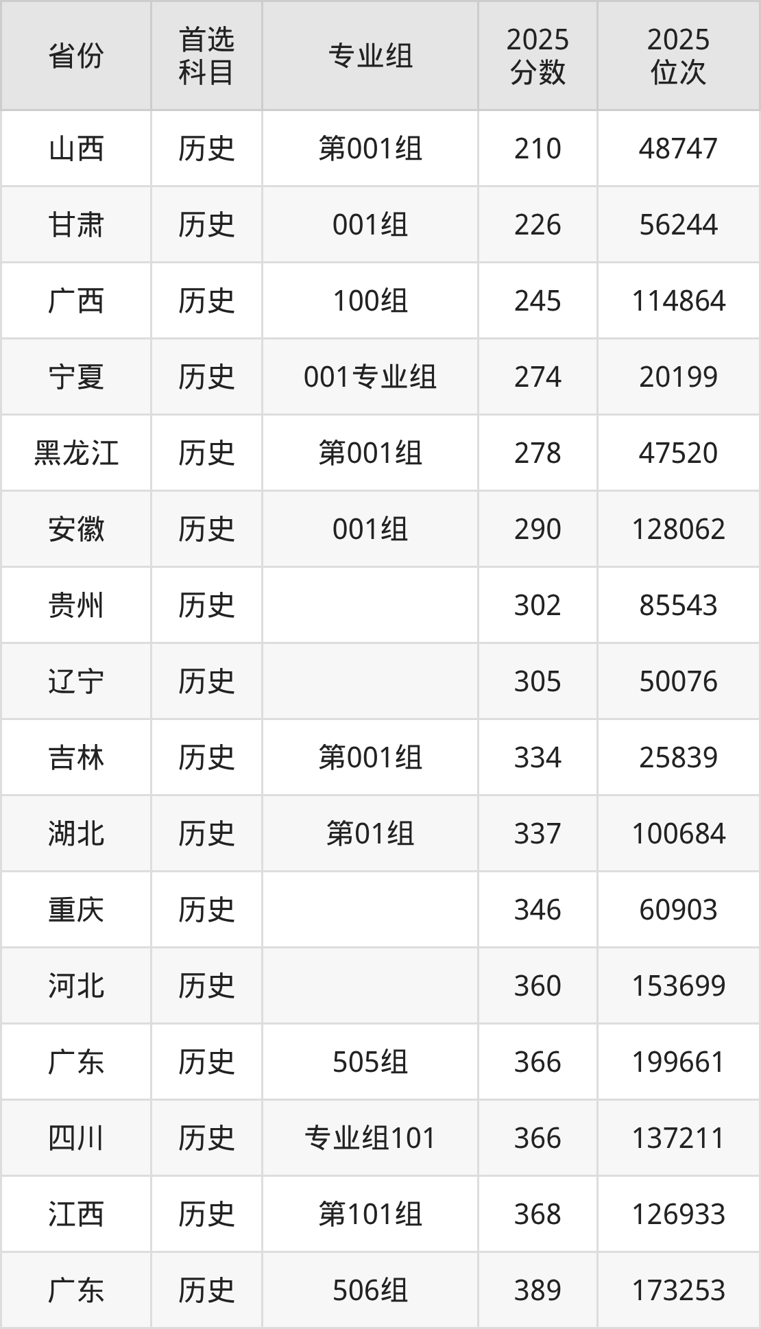 历史类最低分对应地区为山西(第001组),录取位次为48747;最高分对应地区为内蒙古(第001组),录取位次为22305,超专科线244分。