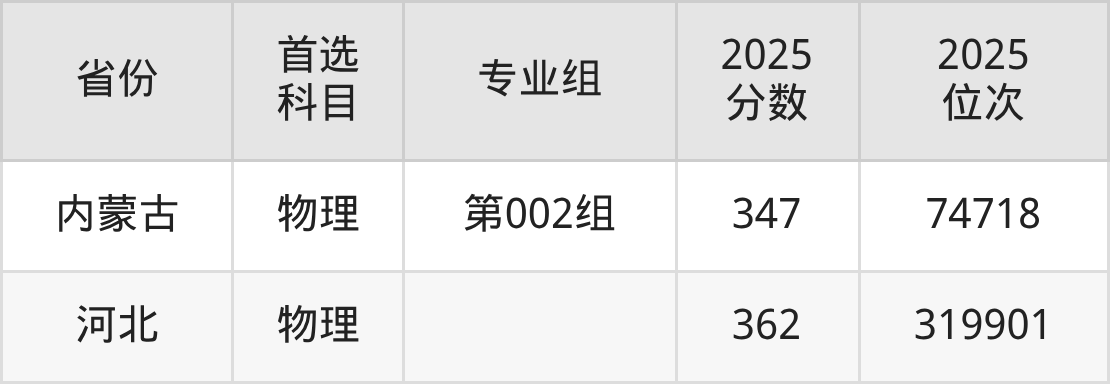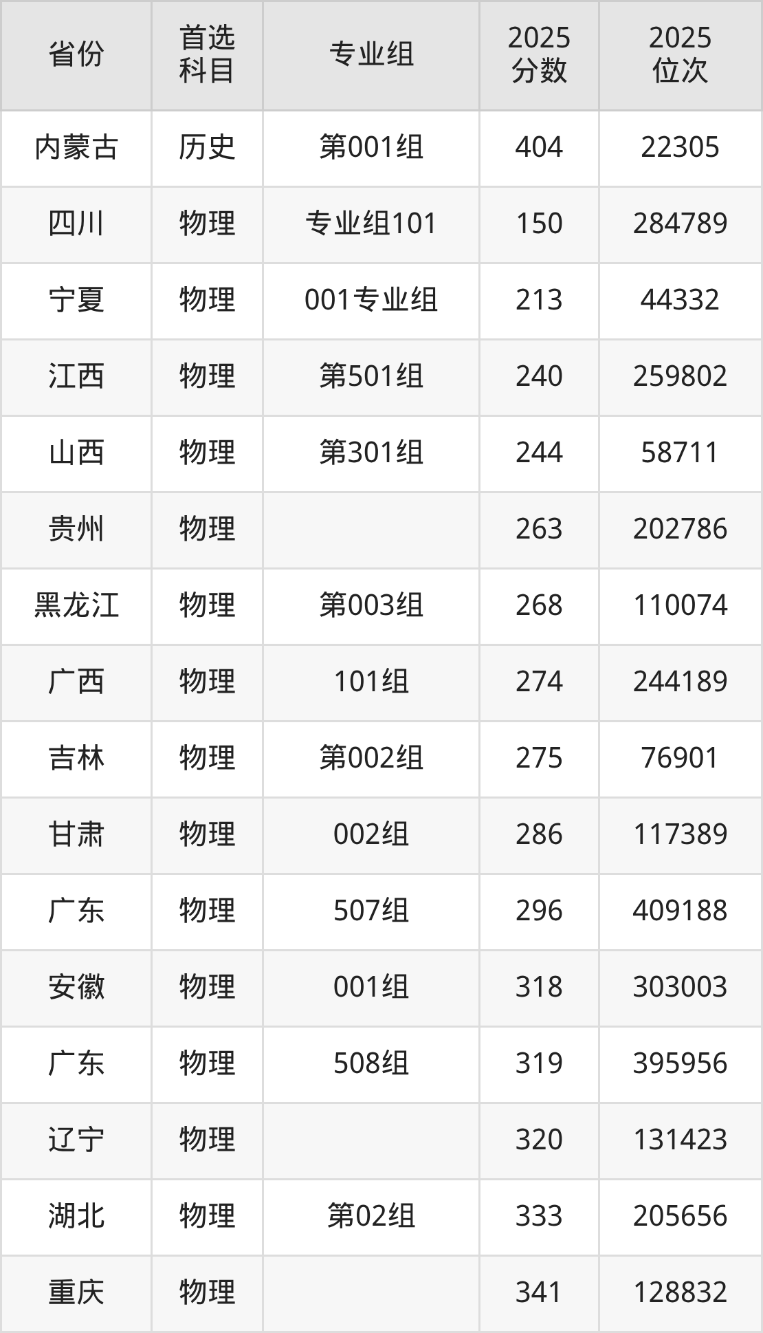 物理类最低分对应地区为四川(专业组101),录取位次为284789;最高分对应地区为河北,录取位次为319901,超专科线162分。