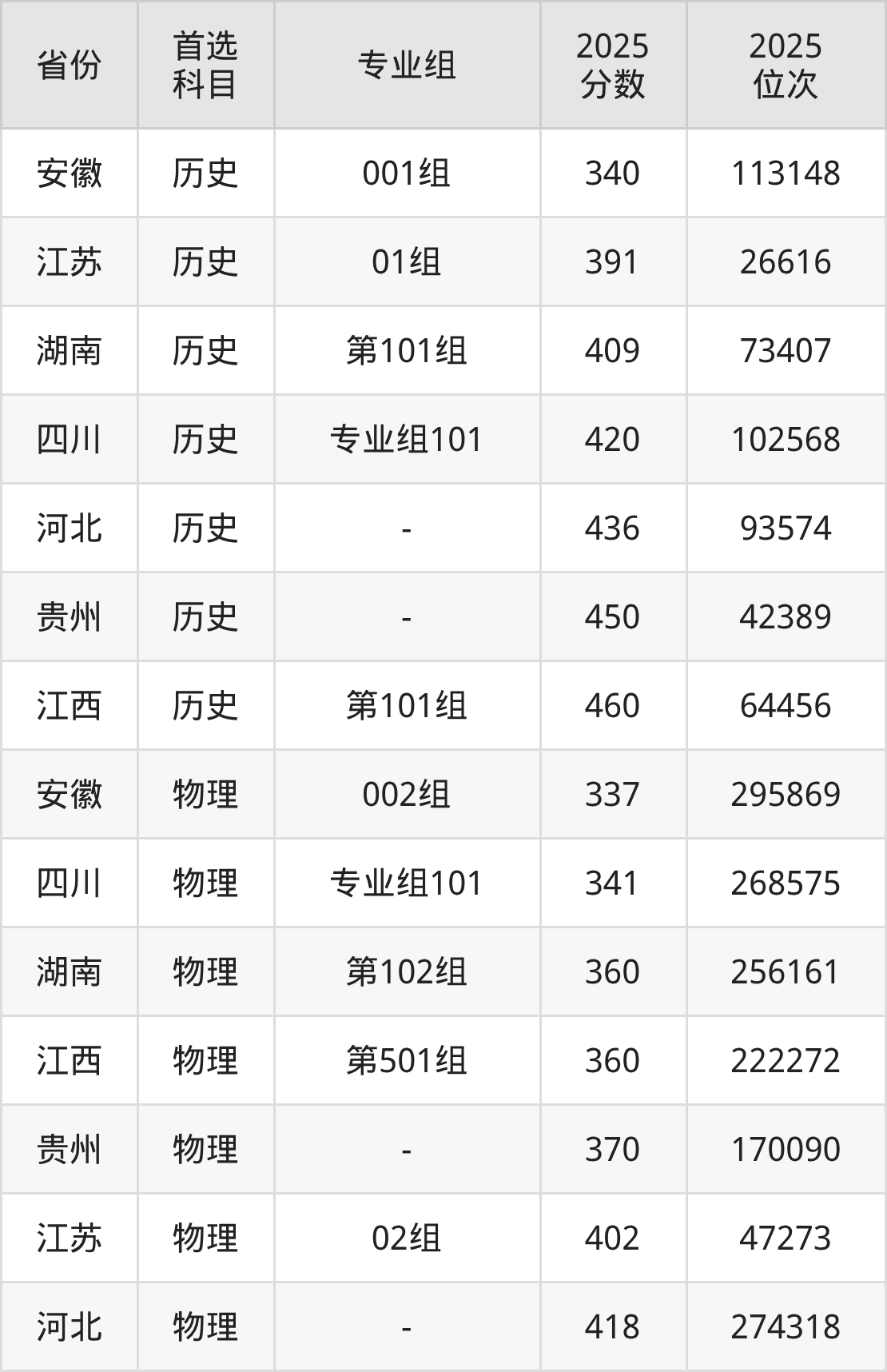 历史类最低分对应地区为安徽(001组),录取位次为113148;最高分对应地区为江西(第101组),录取位次为64456。