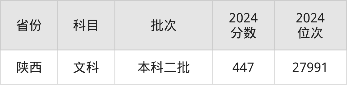 文科最低分对应地区为陕西,录取位次为27991,超二本线50分。