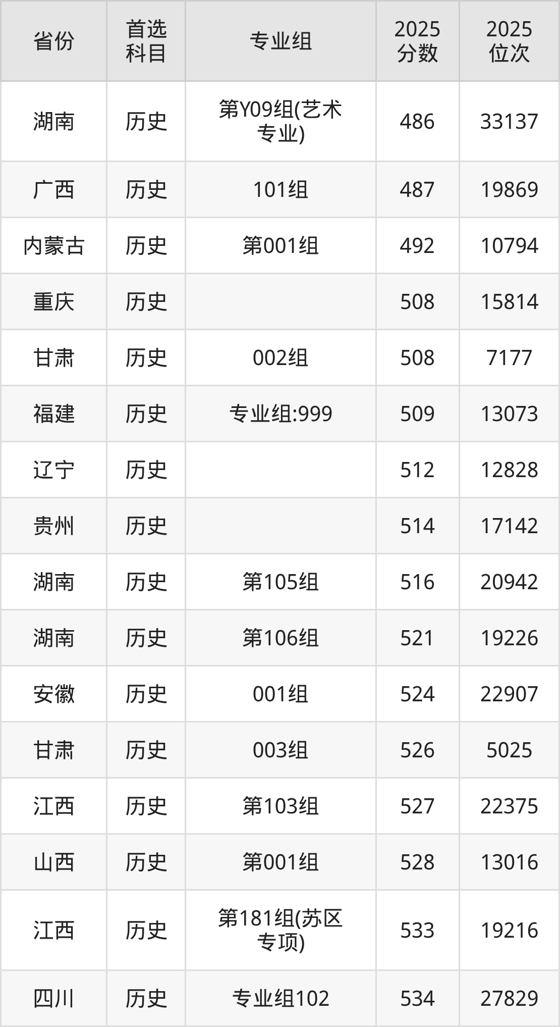 历史类最低分对应地区为湖南(第Y09组(艺术专业)),录取位次为33137;最高分对应地区为吉林(第001组),录取位次为3896,超本科线165分。
