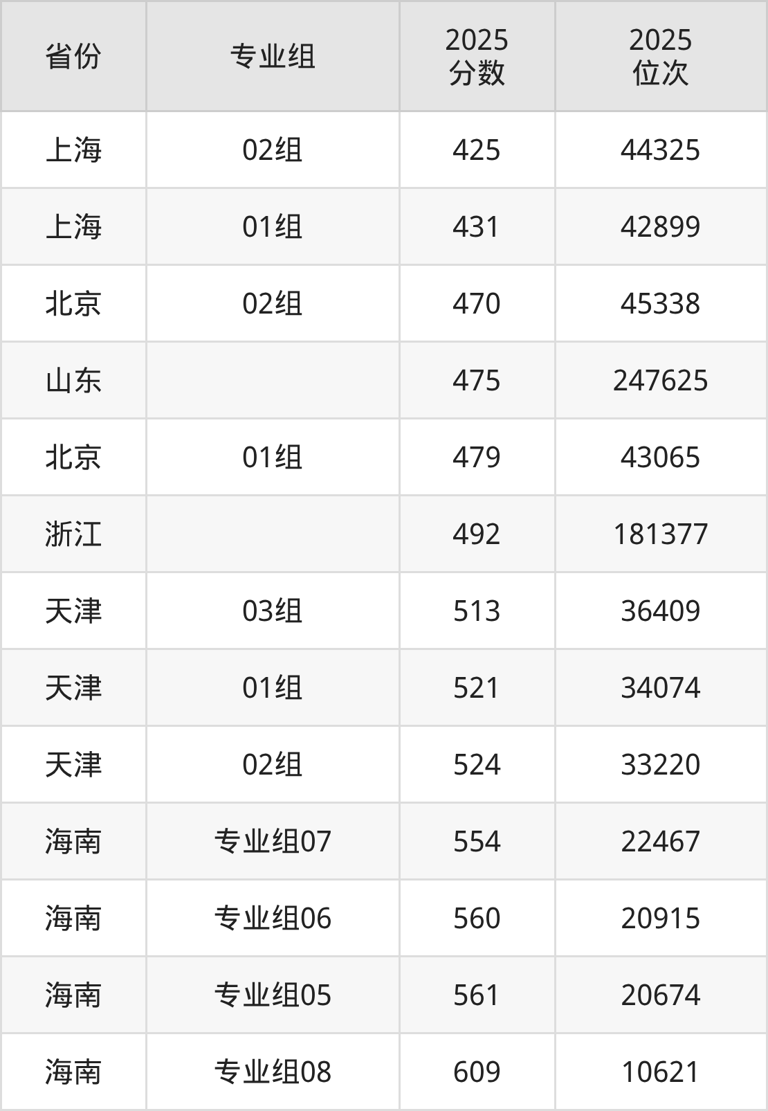 最低分对应地区为上海(02组),录取位次为44325,超本科线23分;最高分对应地区为海南(专业组08),录取位次为10621,超本科线129分。