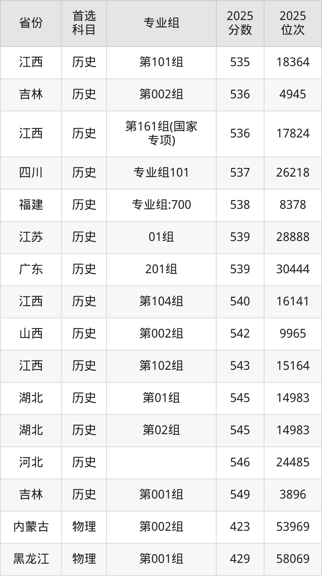 历史类:第101组535分、18364名,第102组543分、15164名,第103组527分、22375名,第104组540分、16141名,第161组(国家专项)536分、17824名,第181组(苏区专项)533分、19216名;