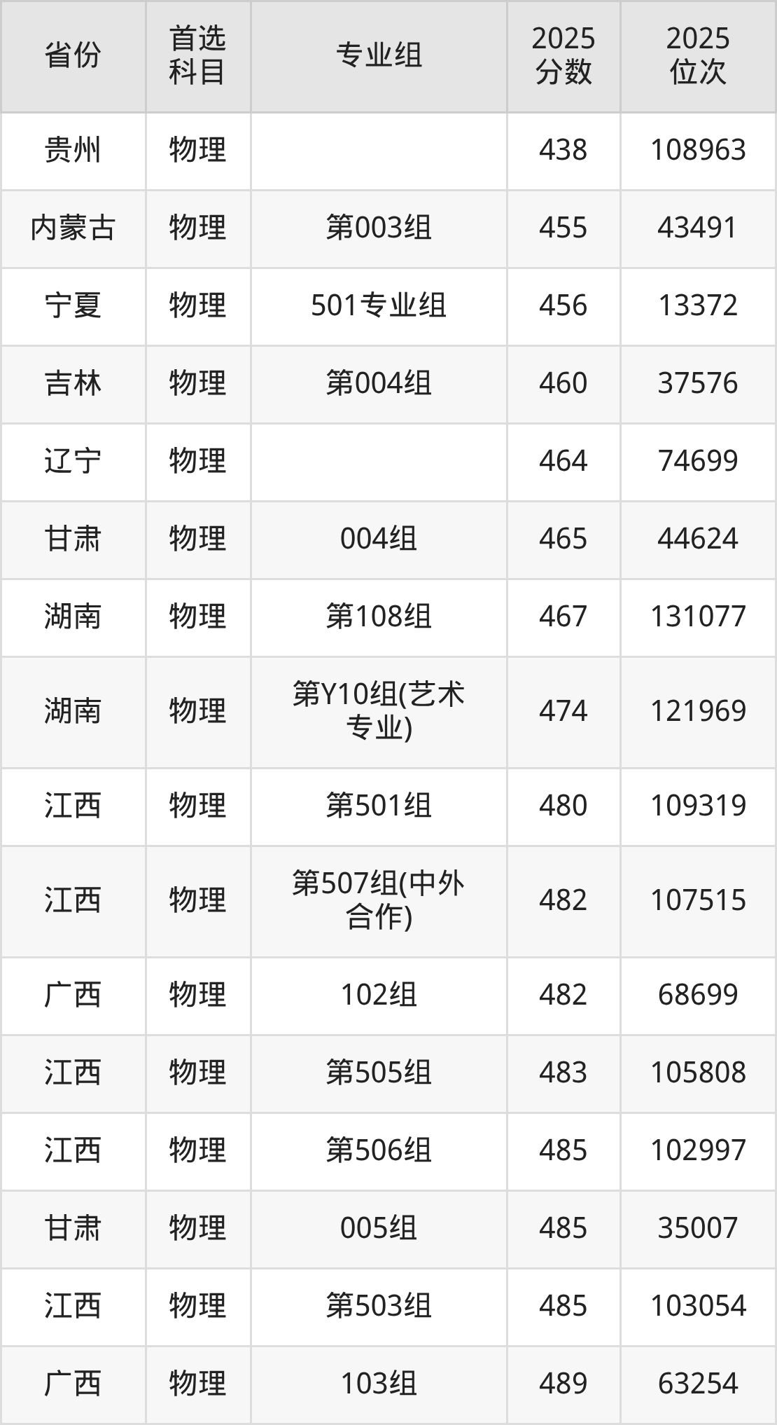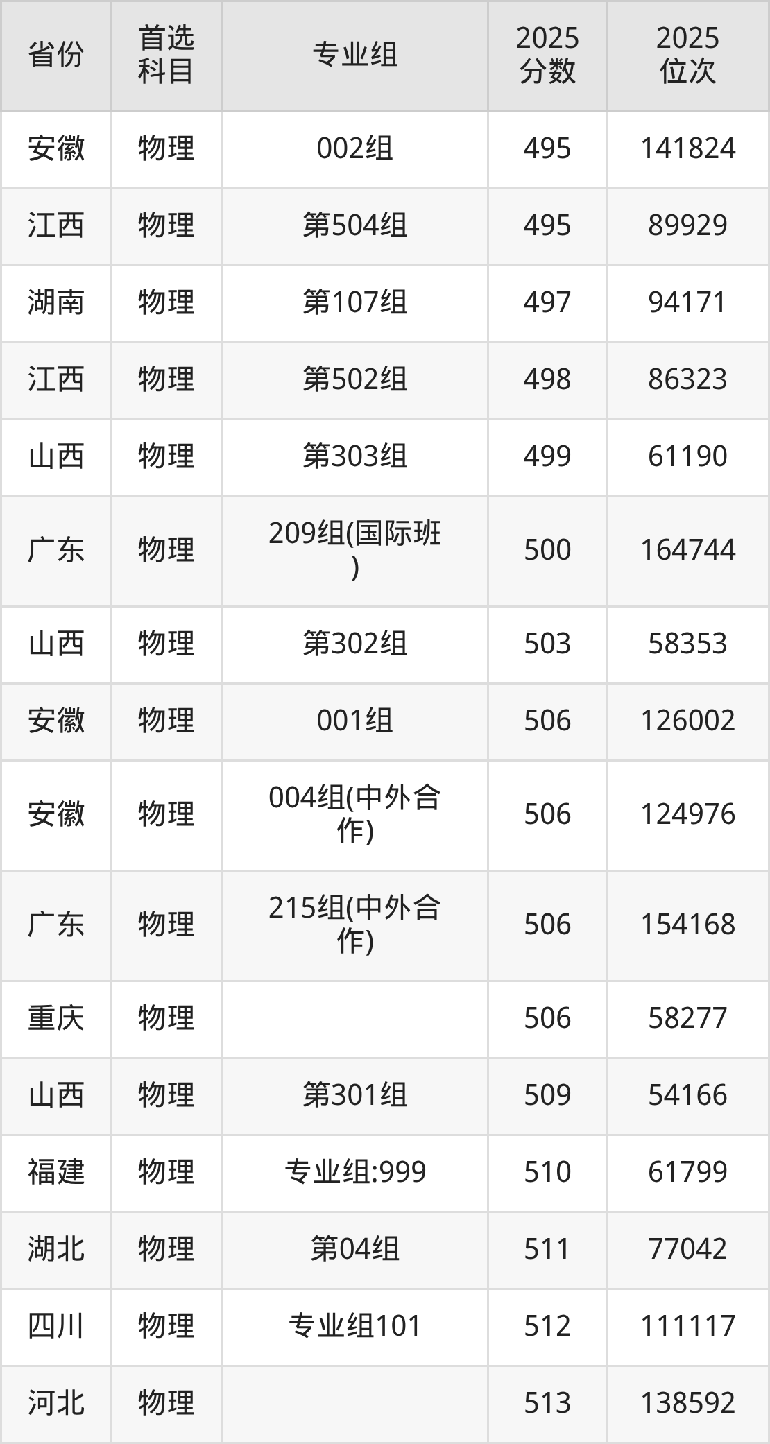 物理类:第501组480分、109319名,第502组498分、86323名,第503组485分、103054名,第504组495分、89929名,第505组483分、105808名,第506组485分、102997名,第507组(中外合作)482分、107515名,第561组(国家专项)529分、52475名,第581组(苏区专项)529分、52166名;