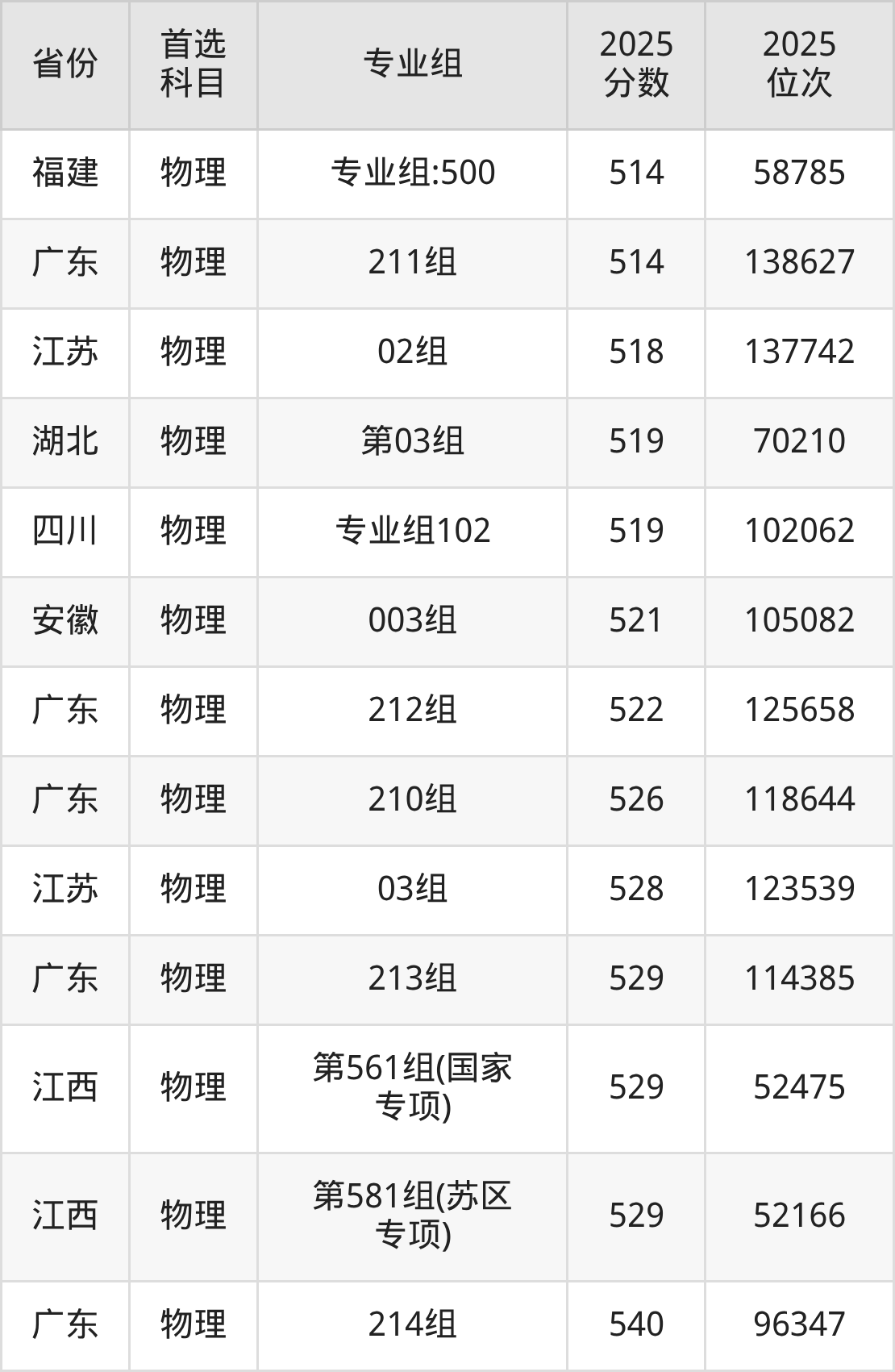 物理类:第501组504分、82215名,第502组502分、84317名,第503组488分、101795名,第561组(国家专项)540分、46438名,第581组(苏区专项)540分、46795名;
