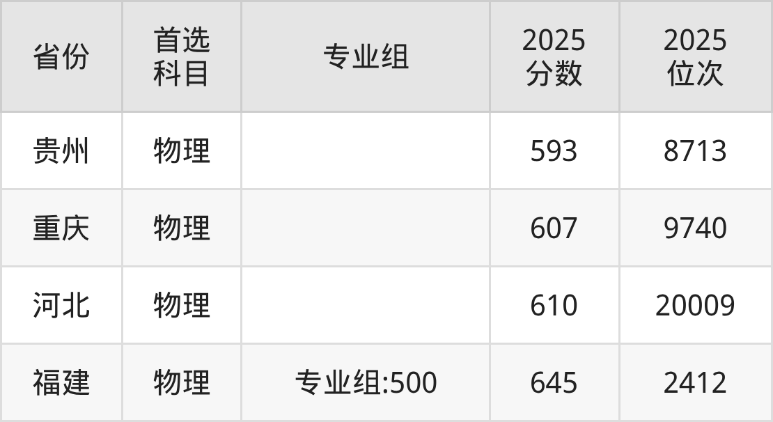 物理类最低分对应地区为贵州,录取位次为8713,超本科线206分;最高分对应地区为福建(专业组:500),录取位次为2412,超本科线204分。