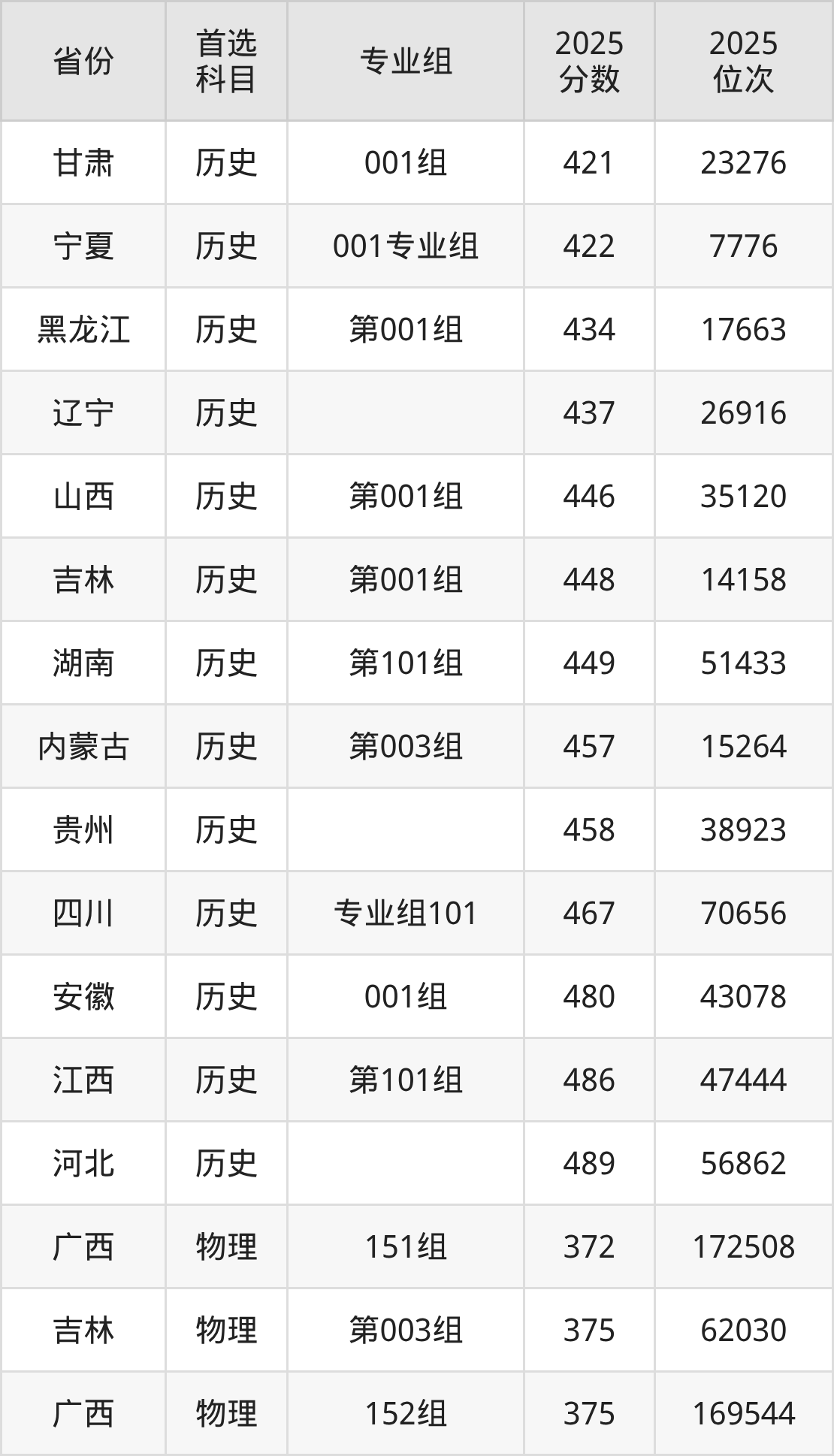 历史类最低分对应地区为甘肃(001组),录取位次为23276,超本科线9分;最高分对应地区为河北,录取位次为56862,超本科线12分。