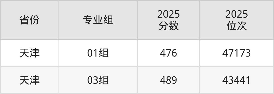 最低分对应地区为天津(01组),录取位次为47173;最高分对应地区为天津(03组),录取位次为43441,超本科线13分。