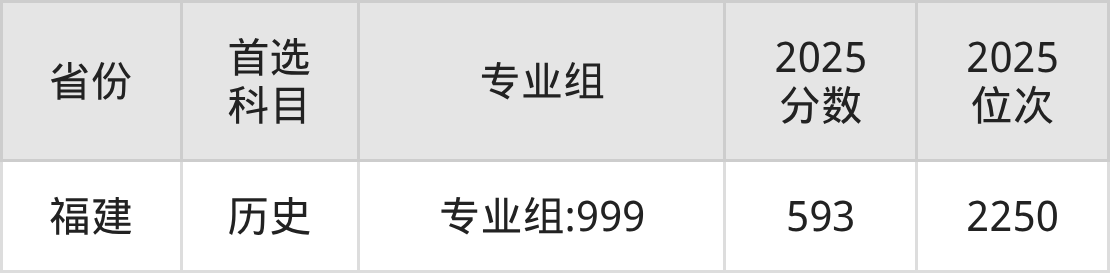 历史类最低分对应地区为福建(专业组:999),录取位次为2250,超本科线143分。