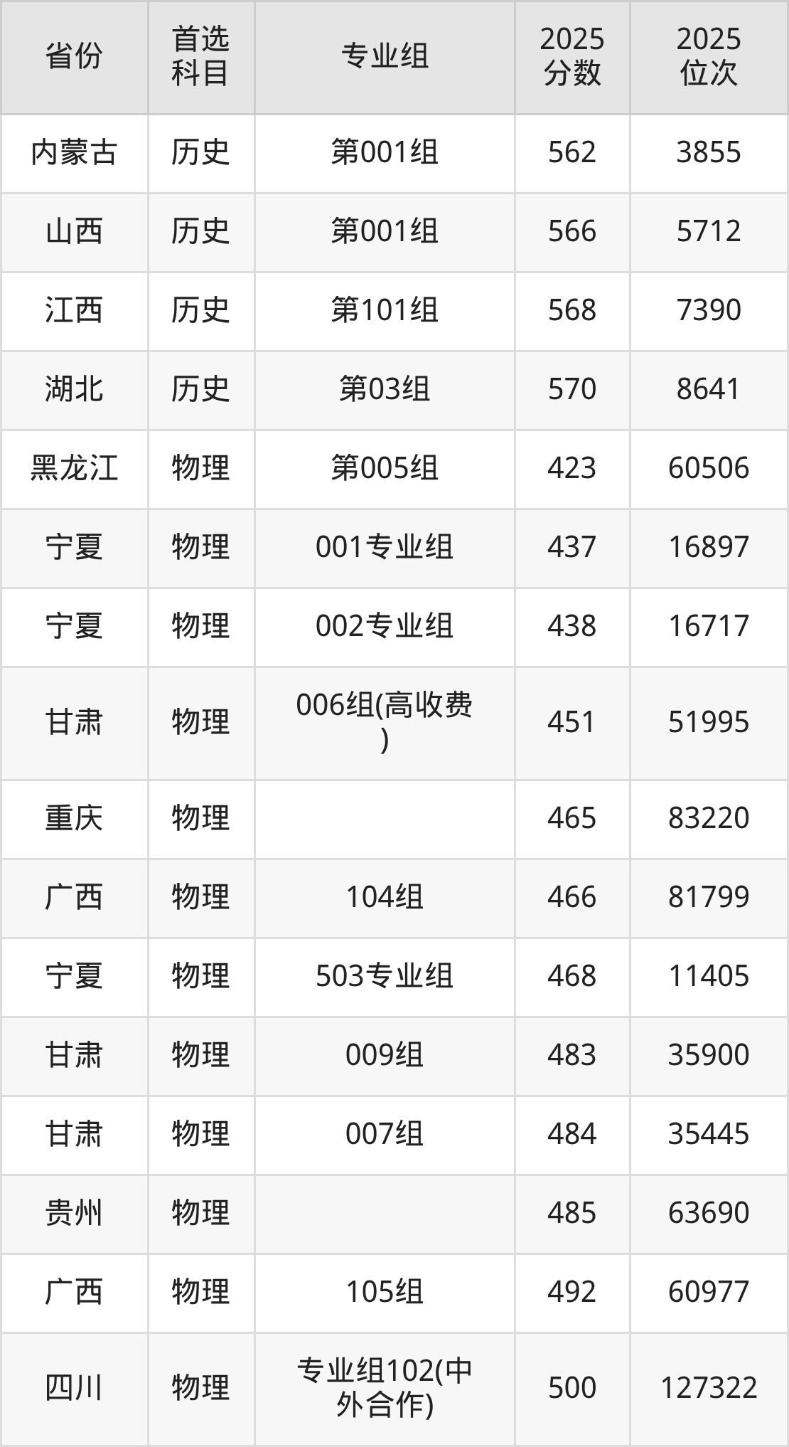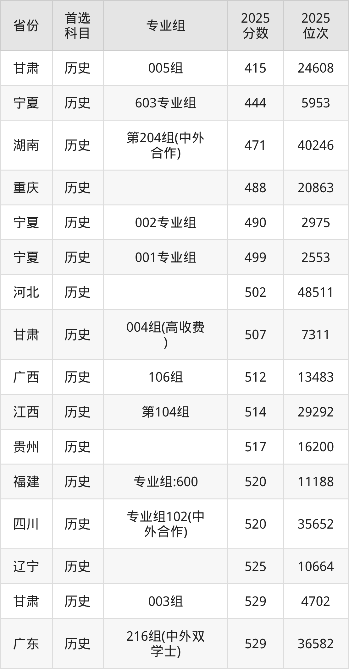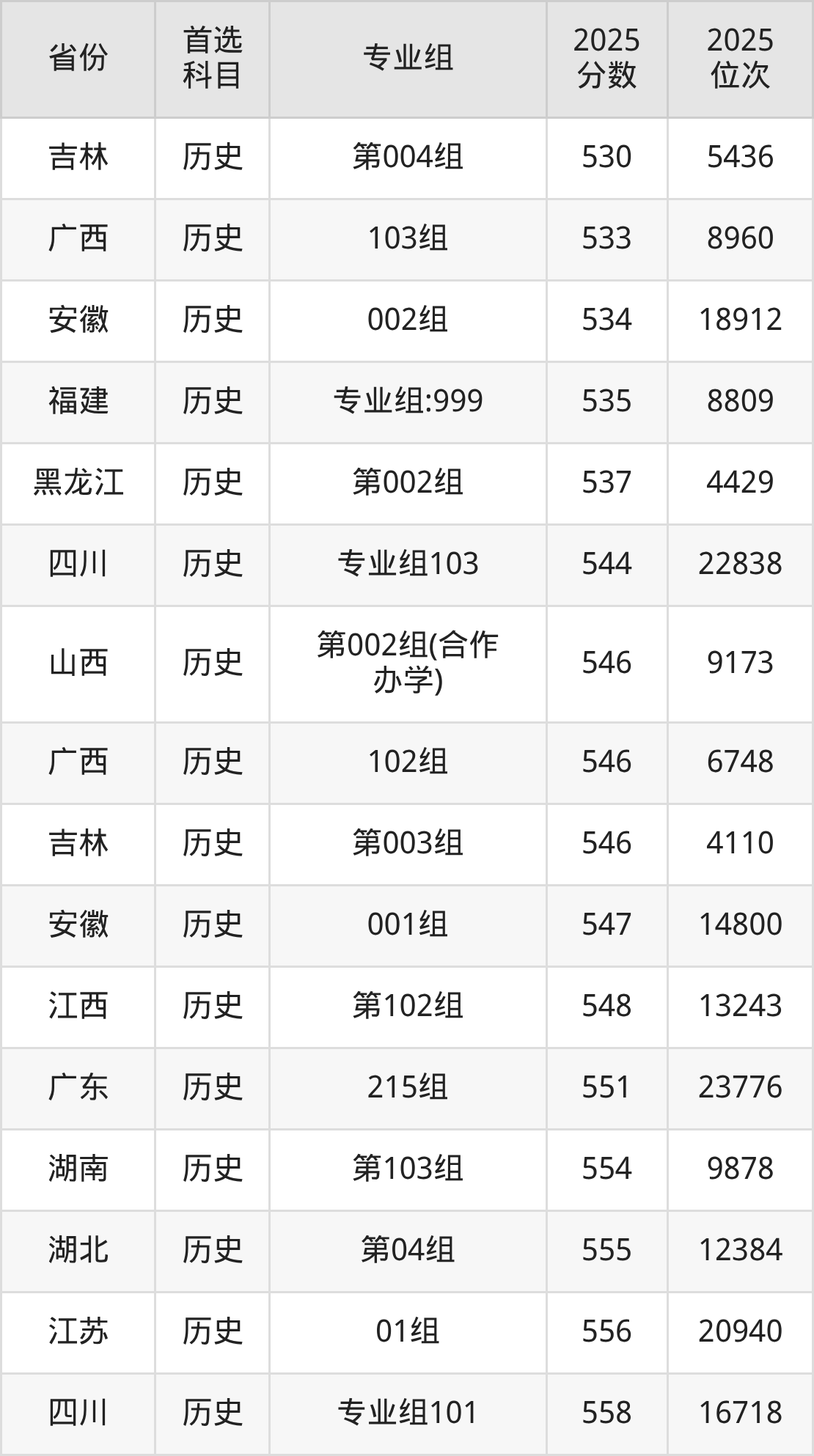 历史类最低分对应地区为甘肃(005组),录取位次为24608,超本科线3分;最高分对应地区为湖北(第03组),录取位次为8641,超本科线128分。