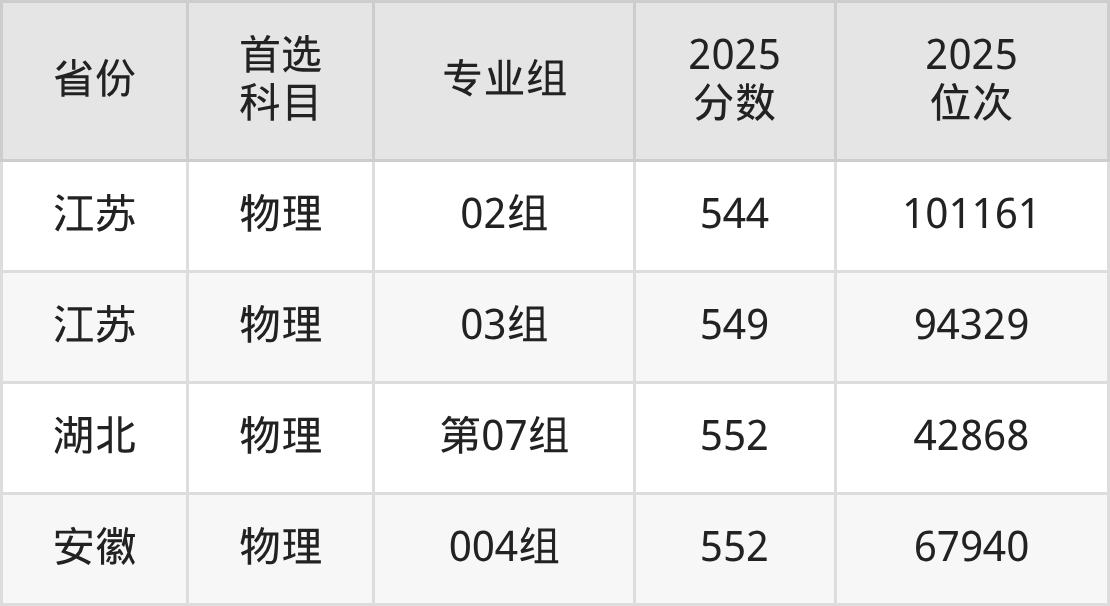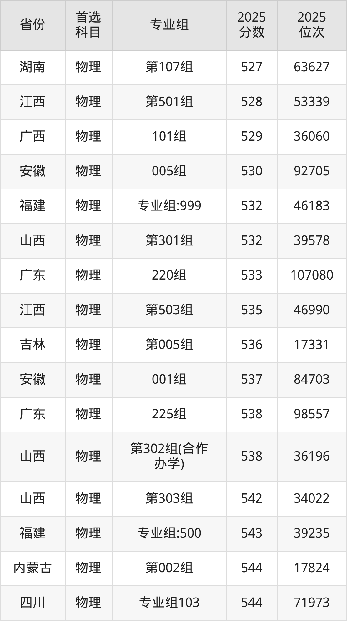物理类最低分对应地区为黑龙江(第005组),录取位次为60506,超本科线63分;最高分对应地区为安徽(004组),录取位次为67940,超本科线91分。