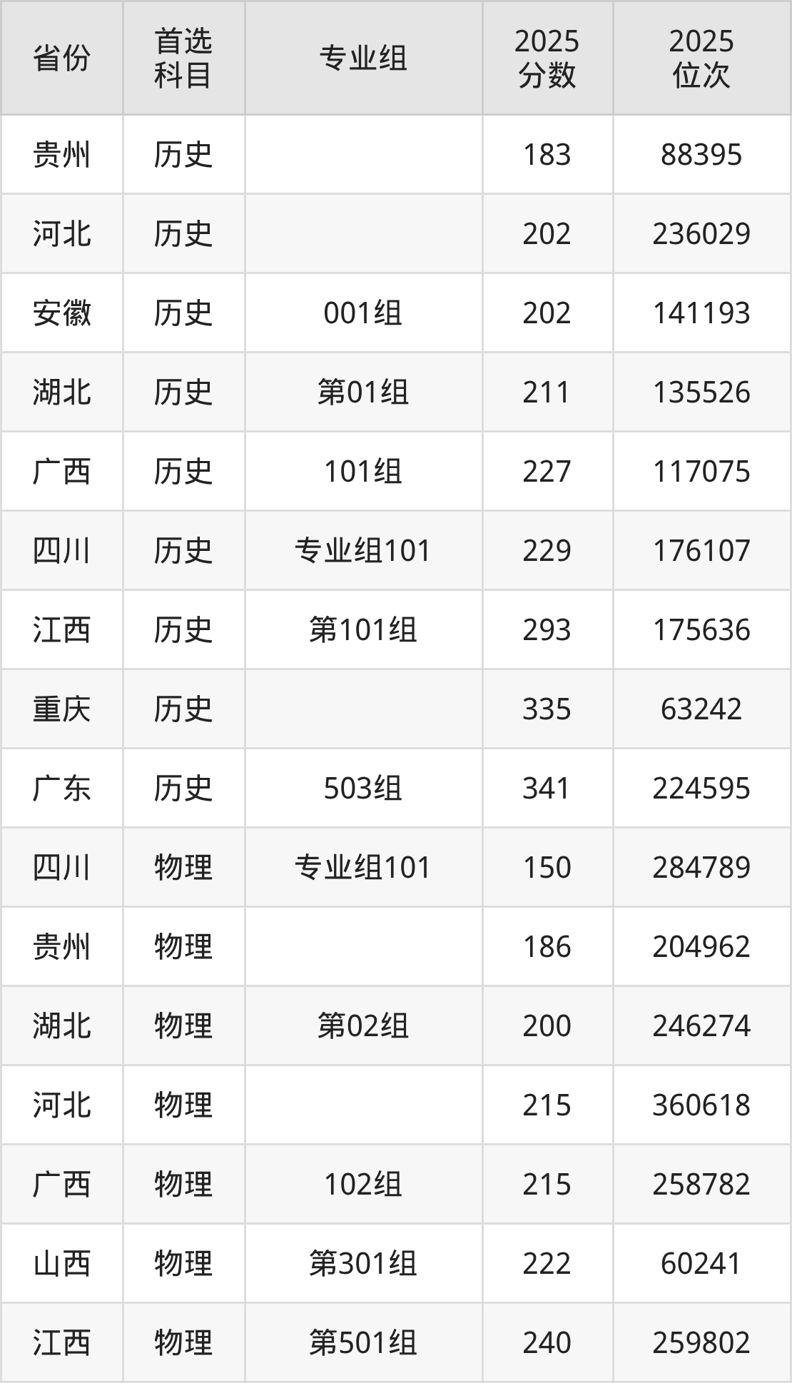 2025年贵州民用航空职业学院在新高考3+1+2地区的录取分数线为:历史类183分-341分、物理类150分-314分。
