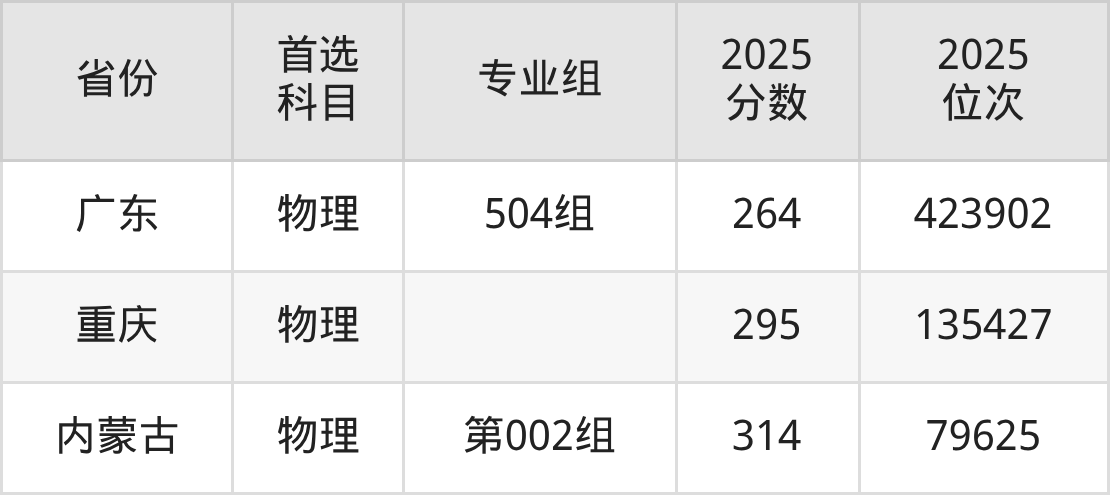物理类最低分对应地区为四川(专业组101),录取位次为284789;最高分对应地区为内蒙古(第002组),录取位次为79625,超专科线154分。