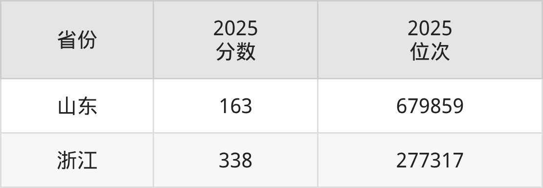 最低分对应地区为山东,录取位次为679859,超二段线13分;最高分对应地区为浙江,录取位次为277317。