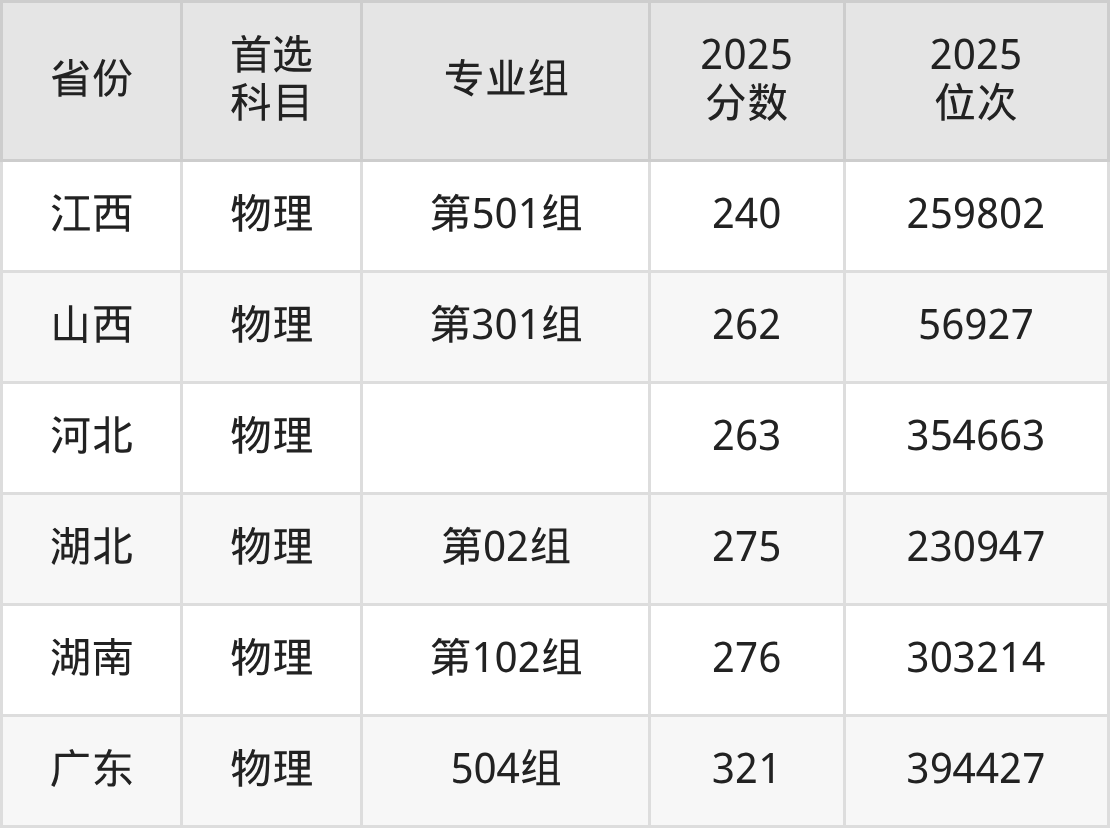 物理类最低分对应地区为四川(专业组101),录取位次为284789;最高分对应地区为广东(504组),录取位次为394427,超专科线121分。