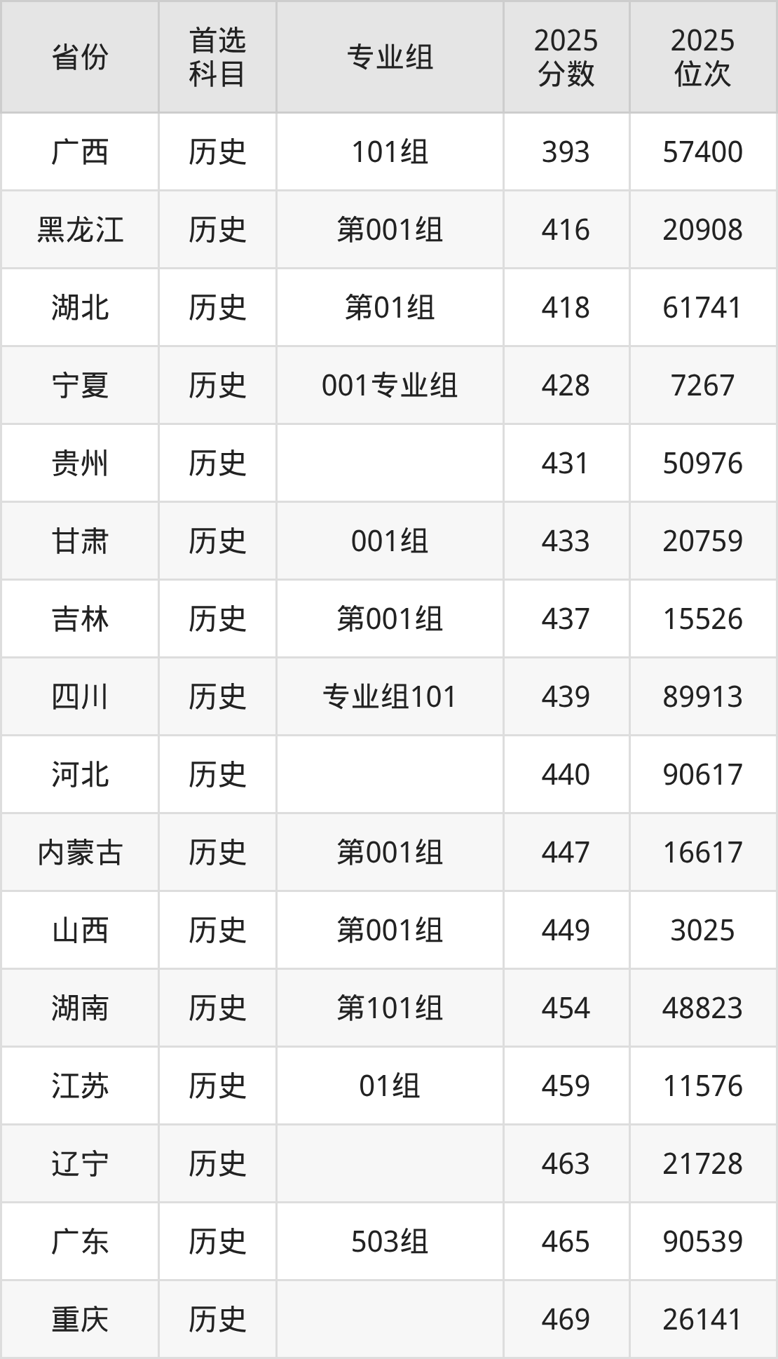 历史类最低分对应地区为广西(101组),录取位次为57400,超专科线193分;最高分对应地区为江西(第101组),录取位次为48957,超专科线193分。