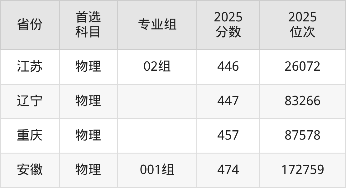 物理类最低分对应地区为吉林(第002组),录取位次为61787,超专科线216分;最高分对应地区为安徽(001组),录取位次为172759,超专科线274分。