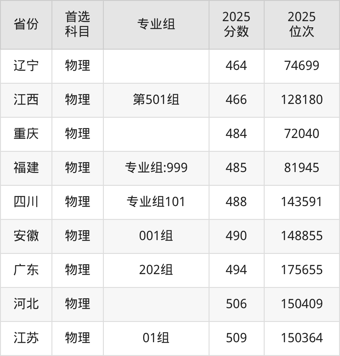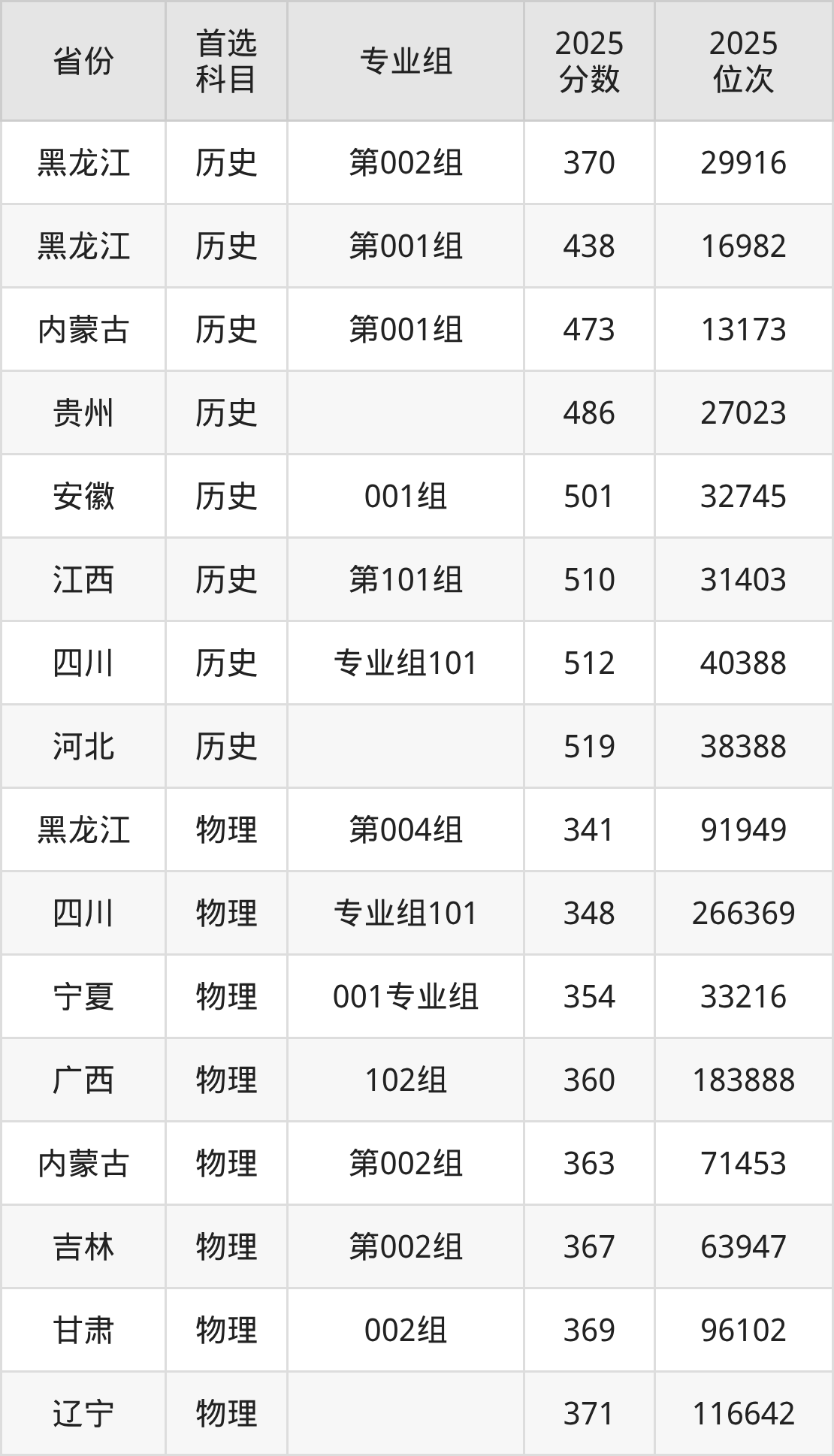 物理类最低分对应地区为黑龙江(第004组),录取位次为91949,超专科线181分;最高分对应地区为江苏(01组),录取位次为150364,超本科线46分。