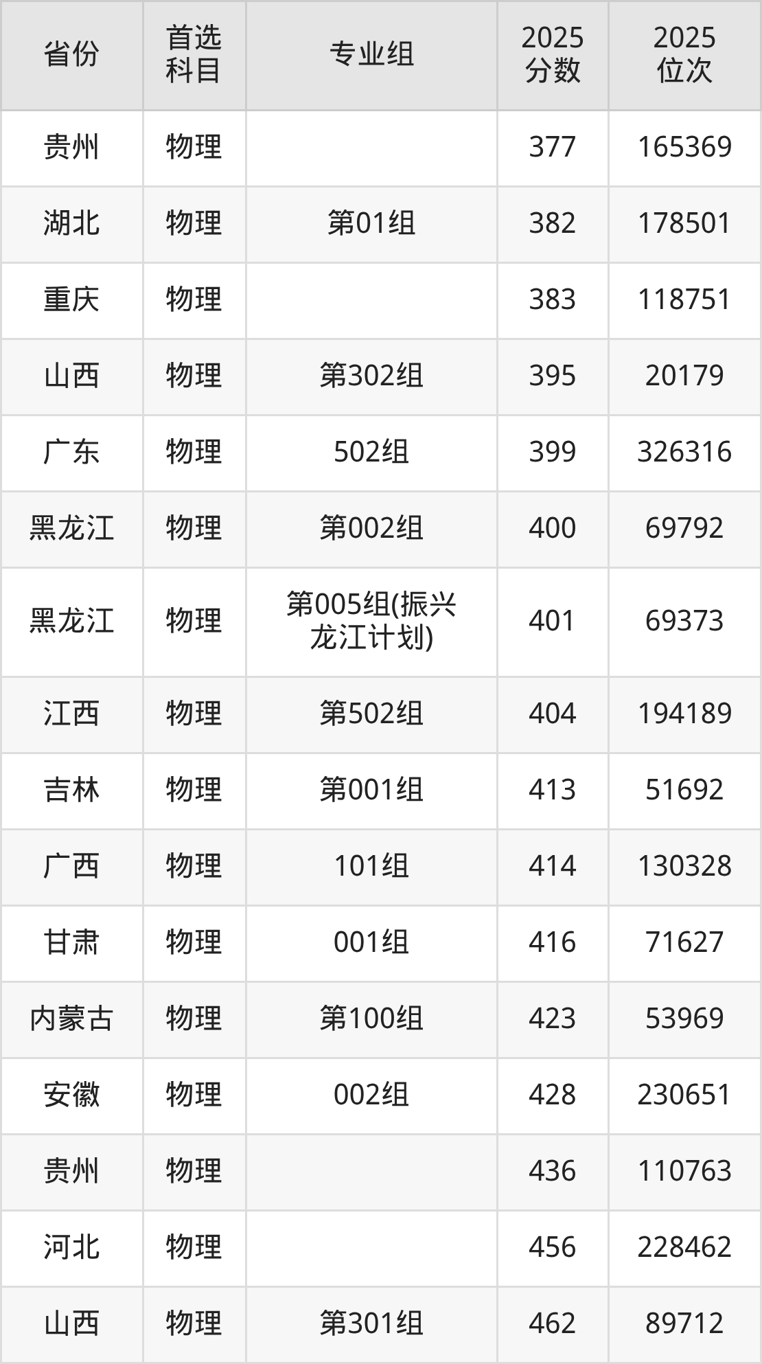 物理类:第002组400分、69792名,第004组341分、91949名,第005组(振兴龙江计划)401分、69373名;
