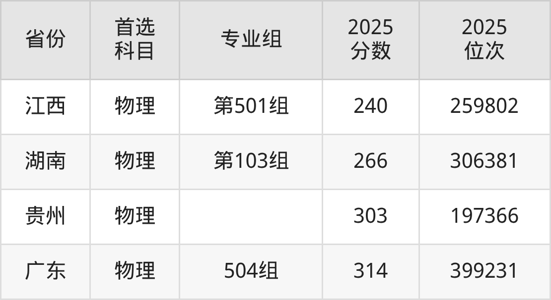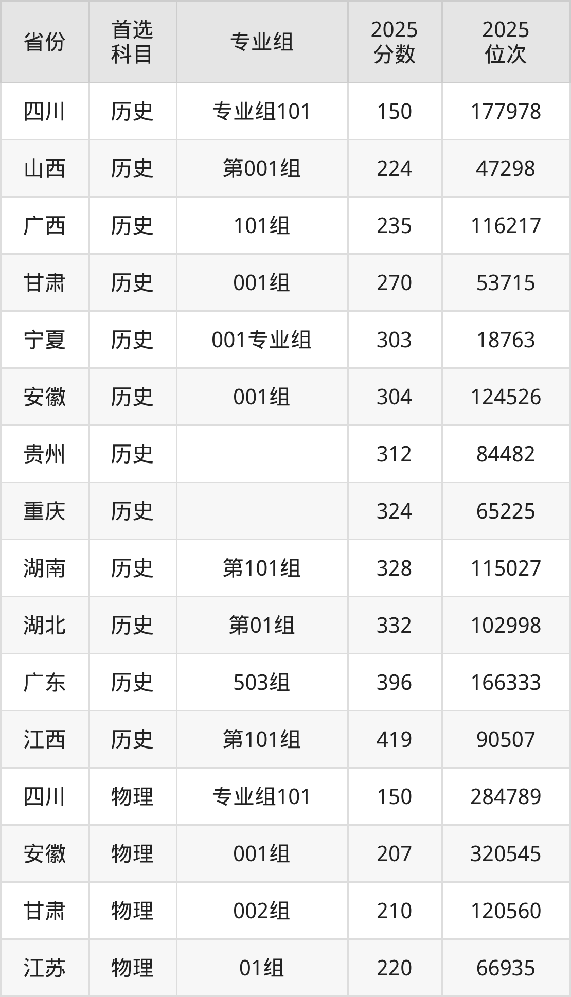 历史类最低分对应地区为四川(专业组101),录取位次为177978;最高分对应地区为江西(第101组),录取位次为90507,超专科线129分。