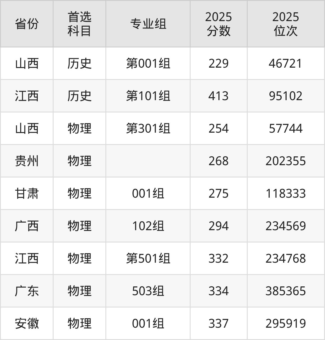 物理类最低分对应地区为山西(第301组),录取位次为57744,超专科线154分;最高分对应地区为安徽(001组),录取位次为295919,超专科线137分。