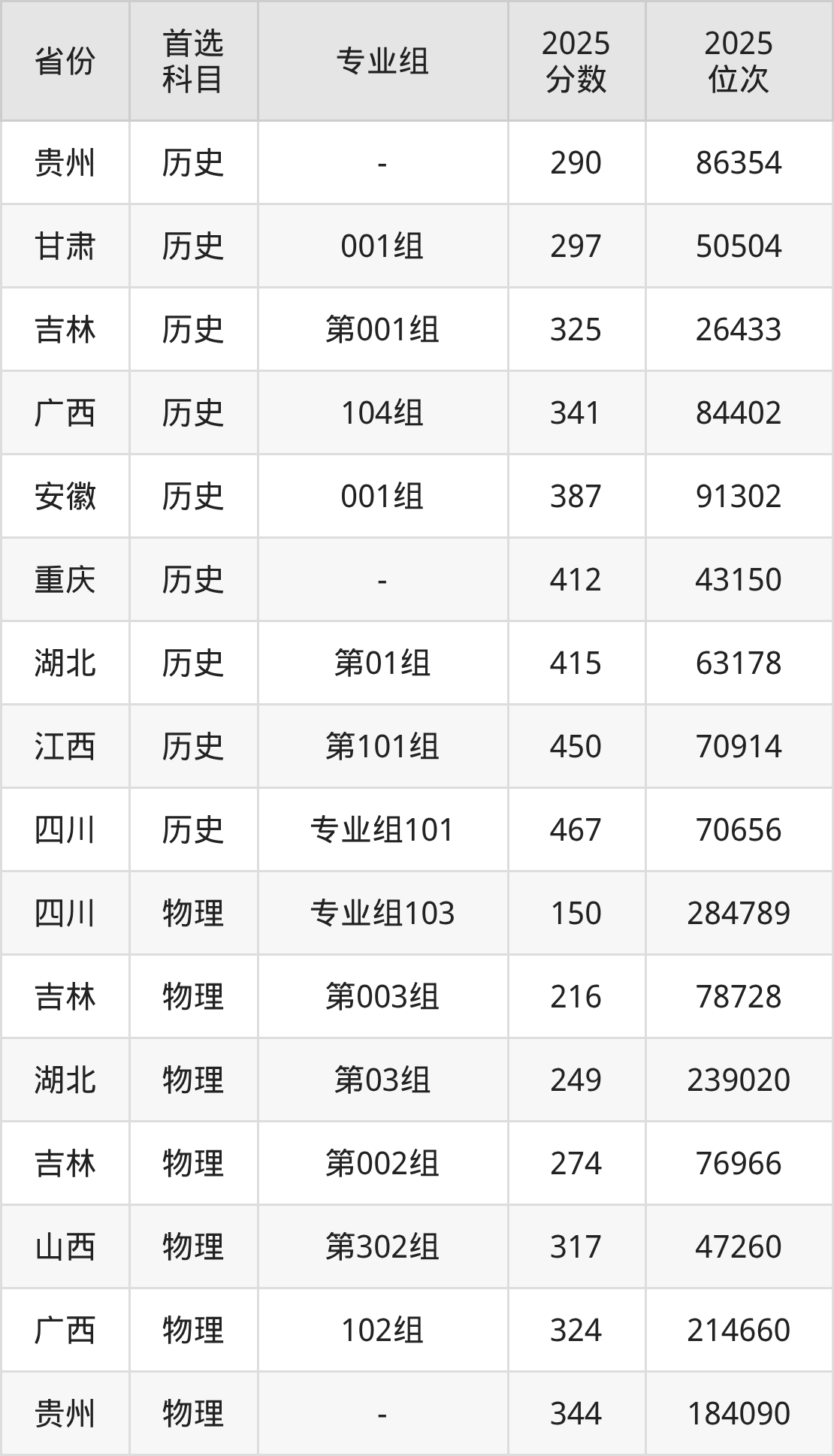历史类最低分对应地区为贵州,录取位次为86354;最高分对应地区为四川(专业组101),录取位次为70656,超专科线317分。