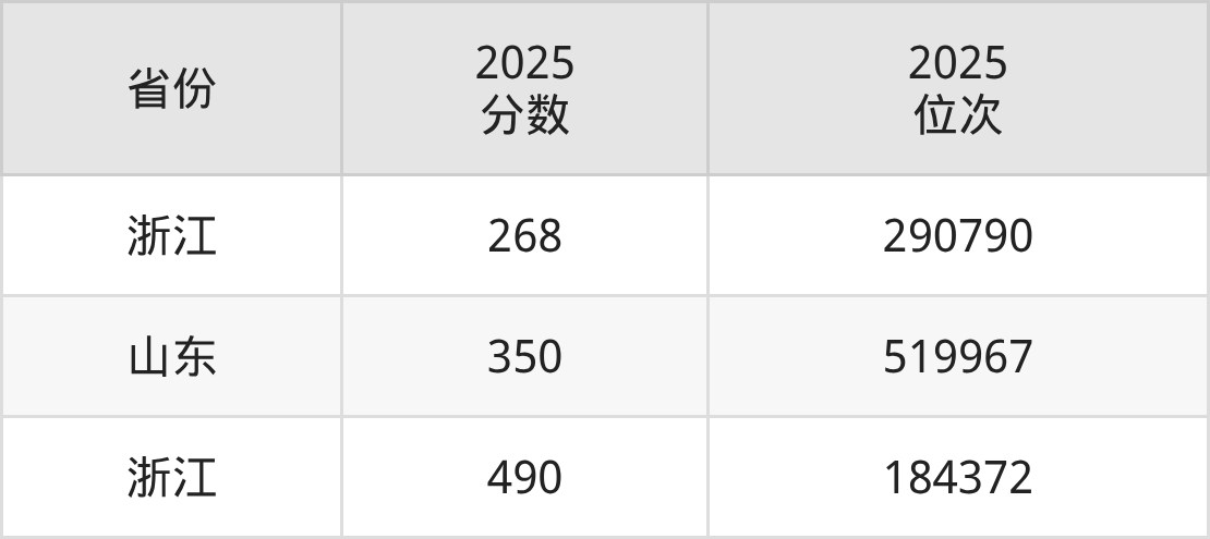 最低分对应地区为浙江,录取位次为290790,超二段线204分;最高分对应地区为浙江,录取位次为184372。