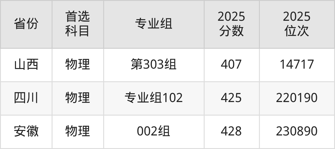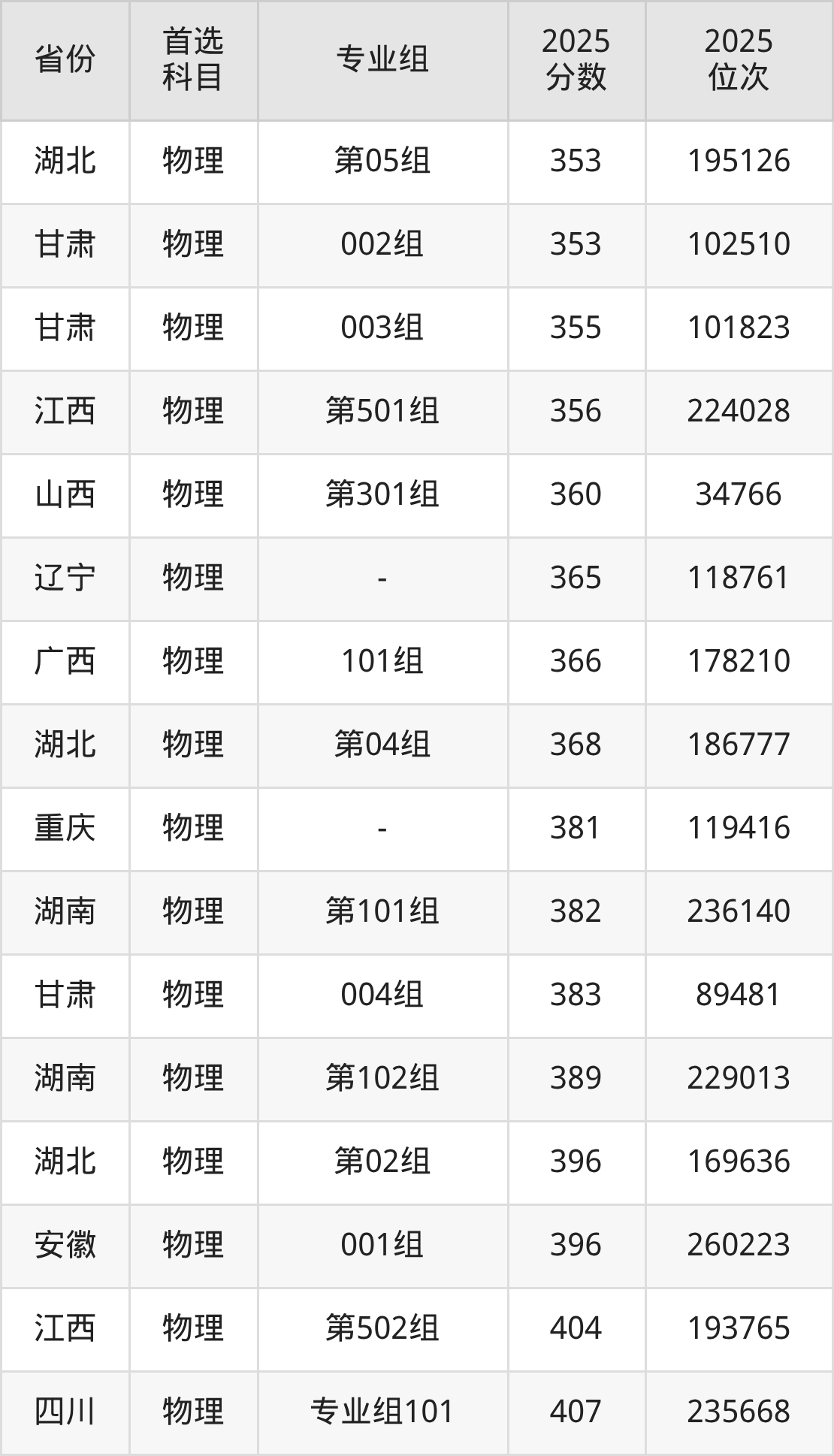 物理类最低分对应地区为四川(专业组103),录取位次为284789;最高分对应地区为安徽(002组),录取位次为230890,超专科线228分。