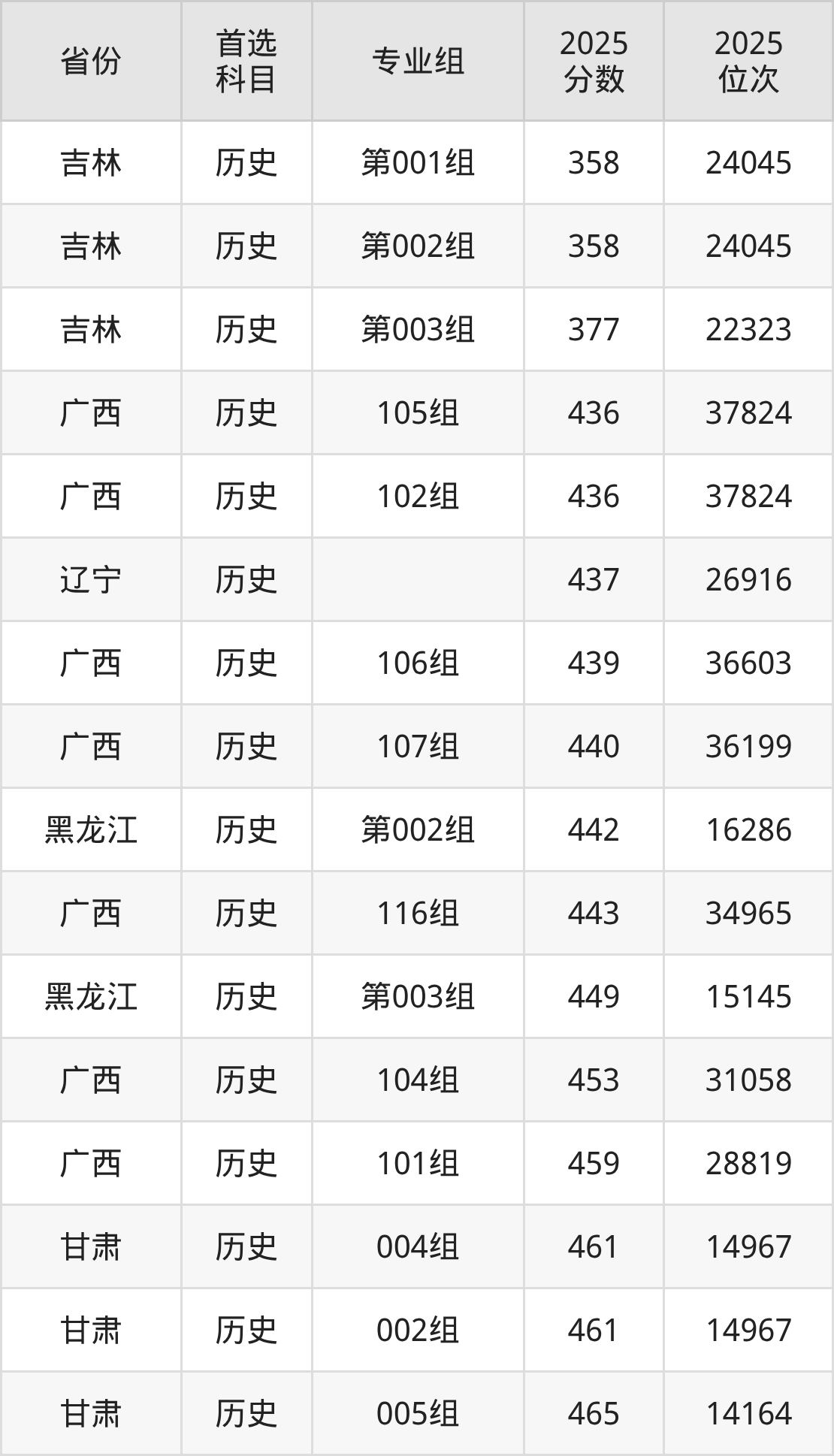历史类最低分对应地区为吉林(第001组),录取位次为24045,低本科线26分;最高分对应地区为山西(第001组),录取位次为10416,超本科线97分。
