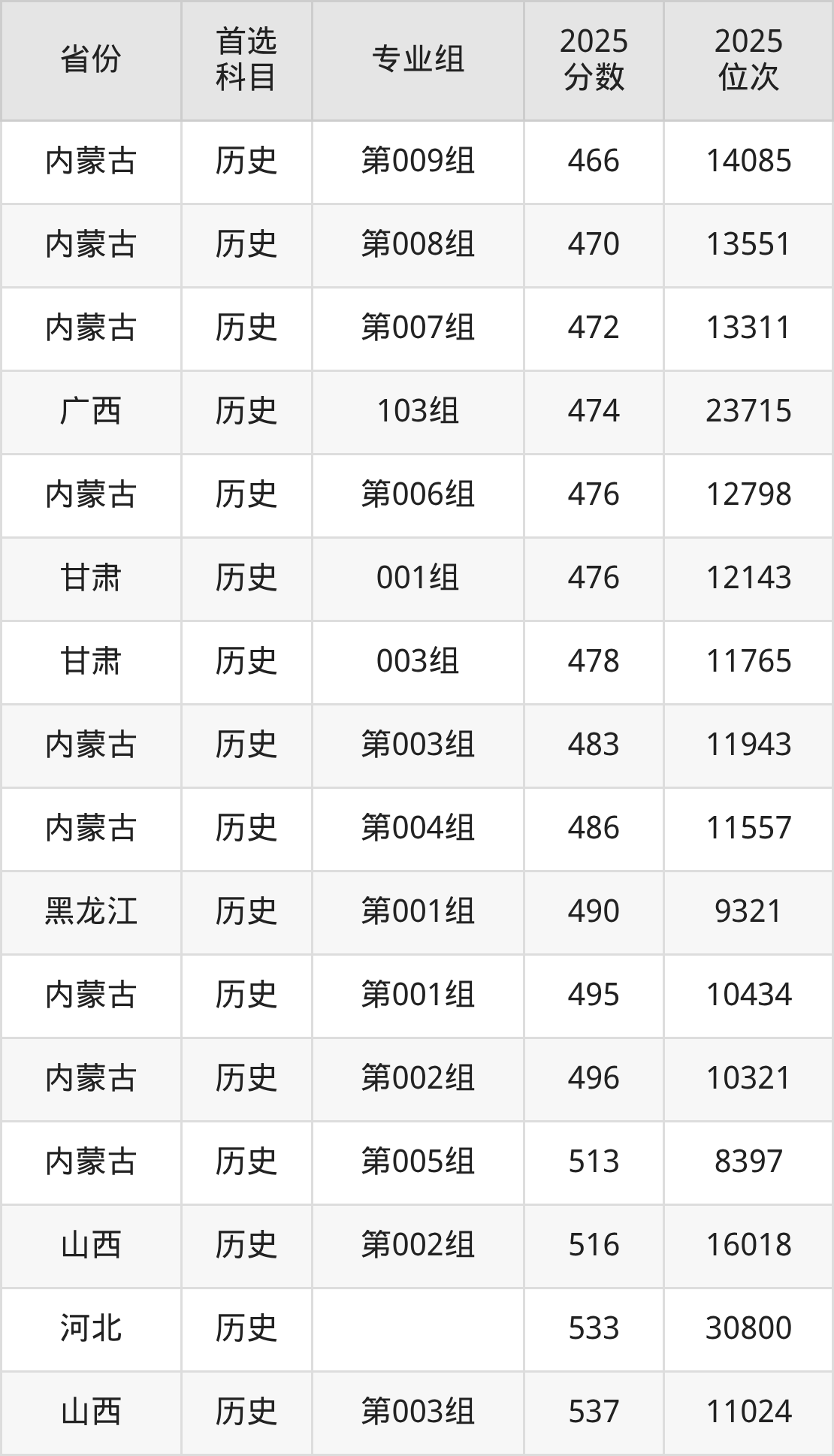 历史类:第001组495分、10434名,第002组496分、10321名,第003组483分、11943名,第004组486分、11557名,第005组513分、8397名,第006组476分、12798名,第007组472分、13311名,第008组470分、13551名,第009组466分、14085名;