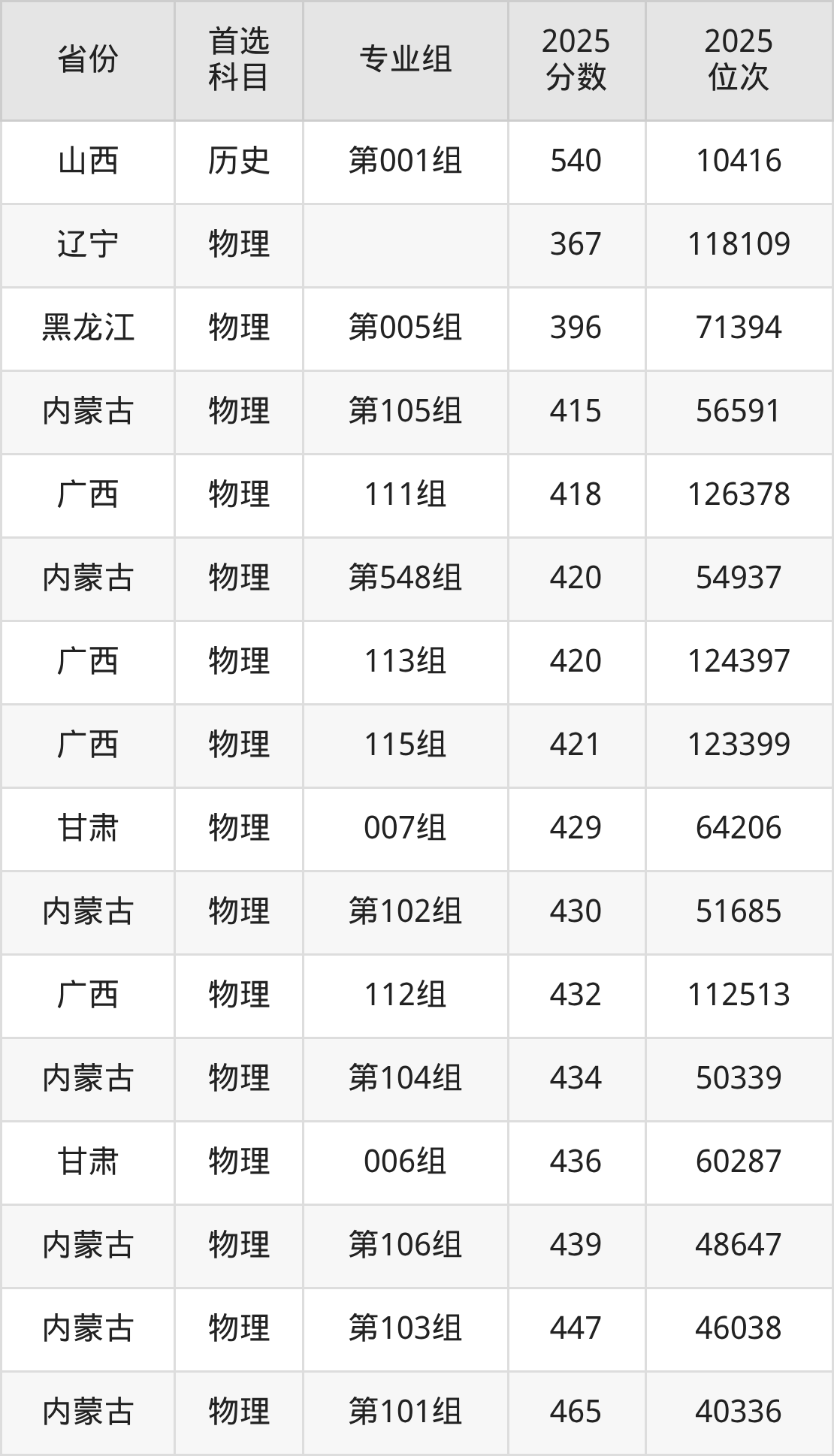 物理类:第101组465分、40336名,第102组430分、51685名,第103组447分、46038名,第104组434分、50339名,第105组415分、56591名,第106组439分、48647名,第107组489分、33044名,第548组420分、54937名;