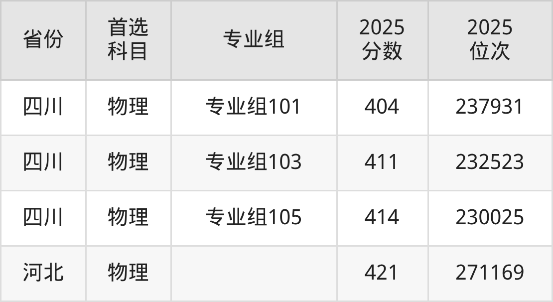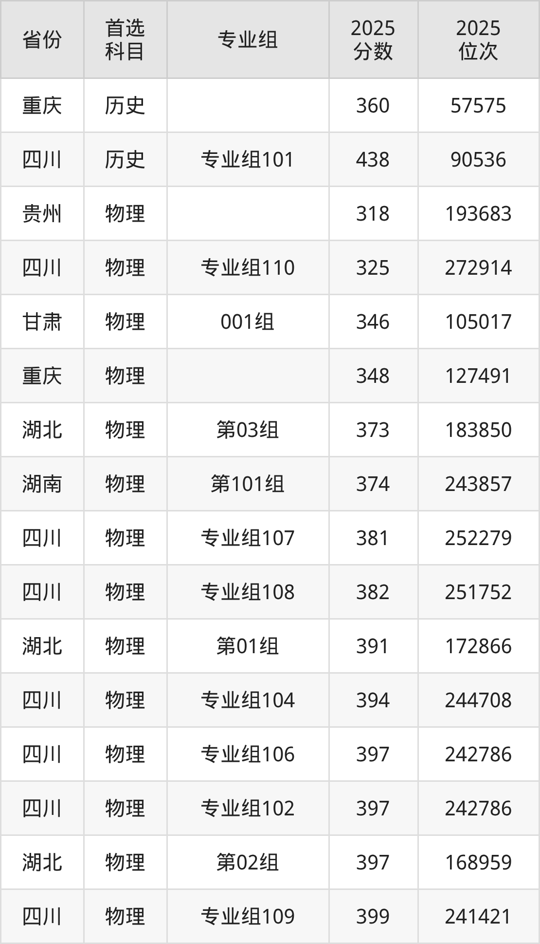 历史类最低分对应地区为重庆,录取位次为57575;最高分对应地区为四川(专业组101),录取位次为90536,超专科线288分。